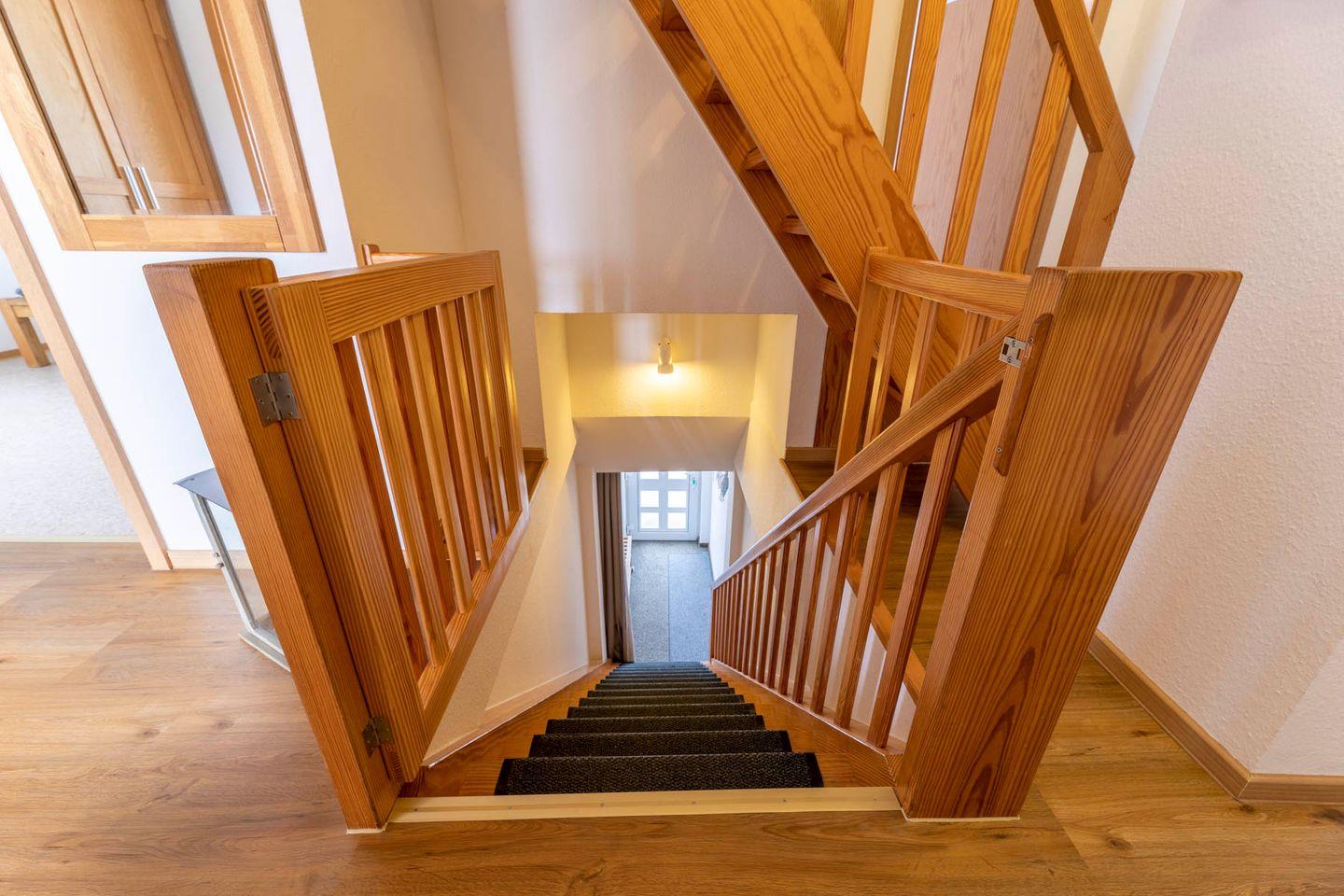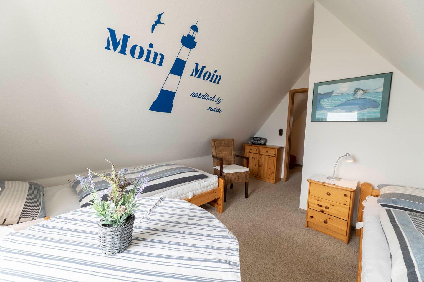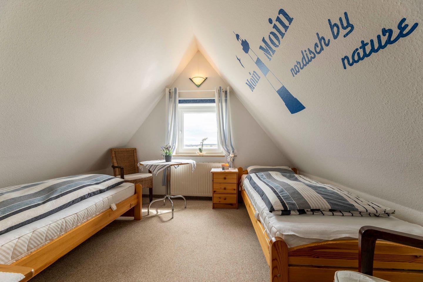 Unter dem Dach, über eine schmale Treppe erreichbar - für Familien mit kleineren Kindern sind alle Treppen mit Treppengittern zu sichern - befinden sich zwei weitere, mit hellen Holzmöbeln eingerichtete Schlafzimmer mit jeweils zwei Betten bzw. einem Einzelbett, beide mit fantastischen Blick über die Ostsee. Beide Zimmer teilen sich ein eigenes Duschbad. Eine gemütliche Leselounge zwischen den Zimmern ermöglicht es, auch hier einen ruhigen Rückzugsort zu finden.