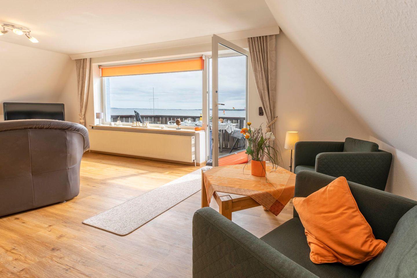 Unsere im 1. Stock gelegene Ferienwohnung „Über dem Meer“, mit bis zu 3 Schlafzimmern und für 5 Personen, empfängt Sie mit einem großen Wohnzimmer, ausgestattet mit zwei Ledersofas, hellen Holzmöbeln, Leseecke mit zwei Sesseln, Flatscreen und einer großen Fensterfront. Von dort können Sie über die gesamte Hohwachter Bucht blicken.