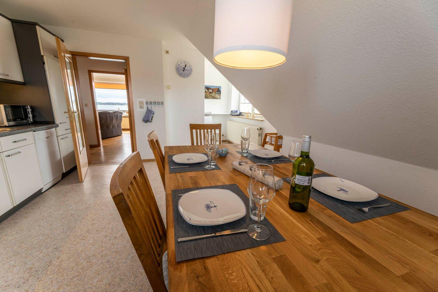 In der angrenzenden großen, mit Essplatz eingerichteten Küche, können Sie auch im Urlaub lecker kochen. Die Küche ist komplett mit Herd, Backofen, Spülmaschine, Mikrowelle, Kühlschrank und kleinem Tiefkühler ausgestattet. Und wenn Sie mal nicht kochen möchten – in der näheren Umgebung finden Sie verschiedenste kulinarische Angebote.