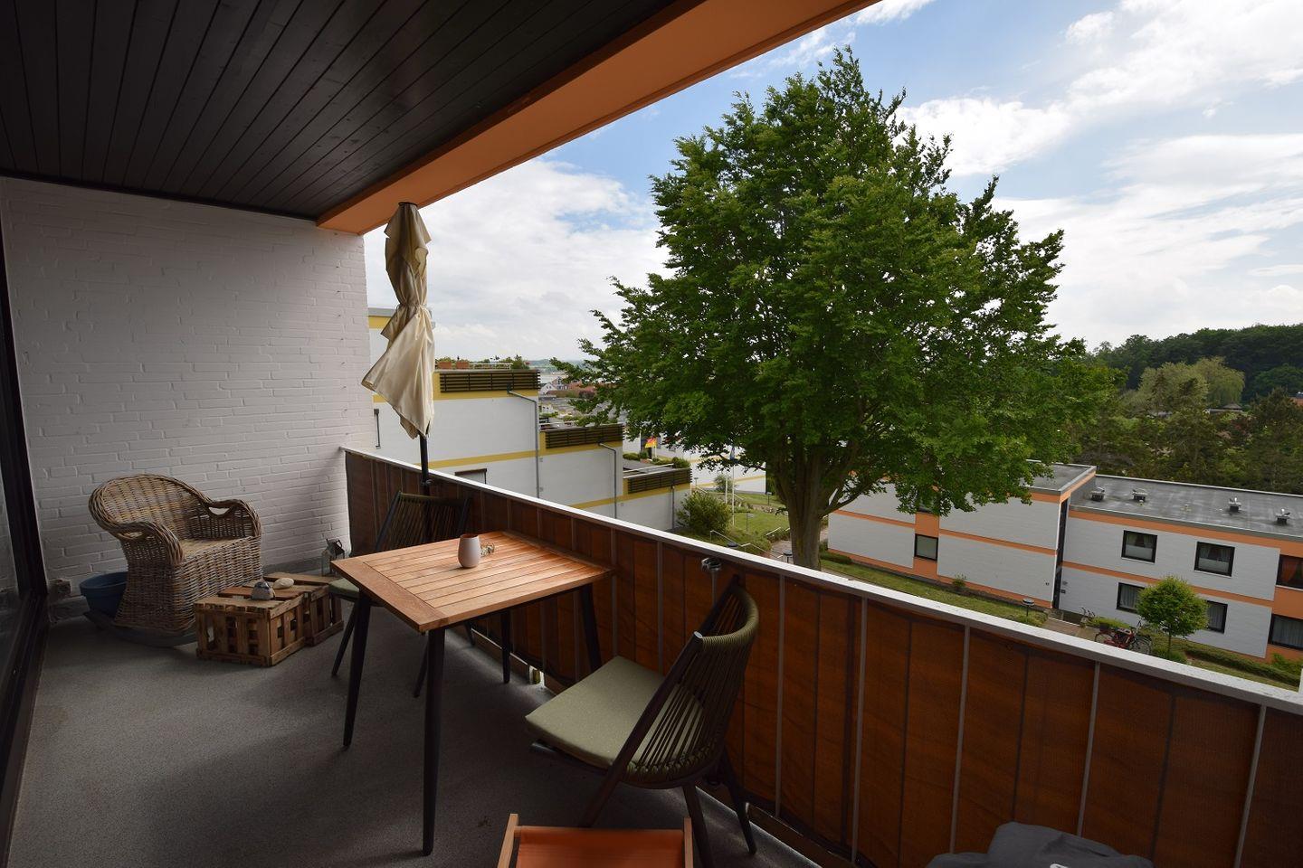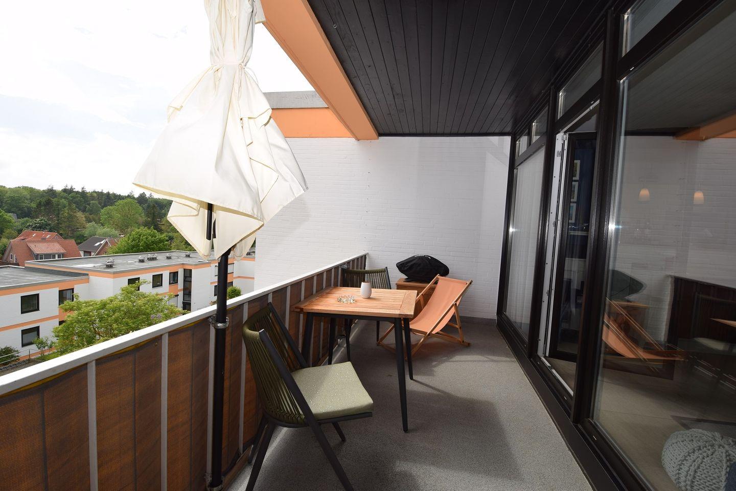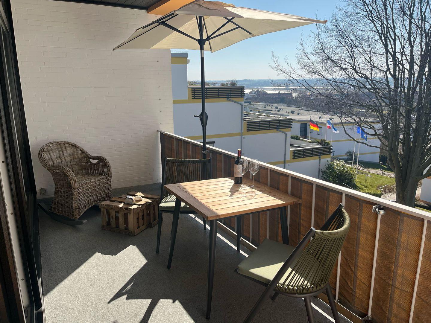Der nach Süden ausgerichtete Balkon der Unterkunft ist nicht nur besonders sonnig, sondern durch seine komplette Überdachung auch bei schlechteren Wetterverhältnissen gut nutzbar.