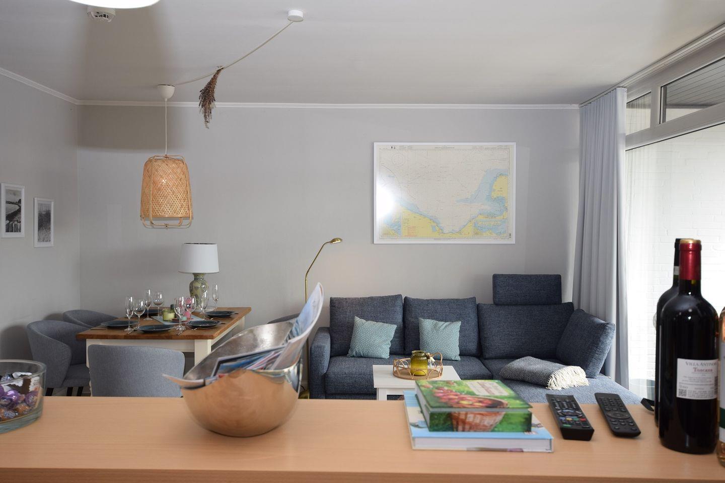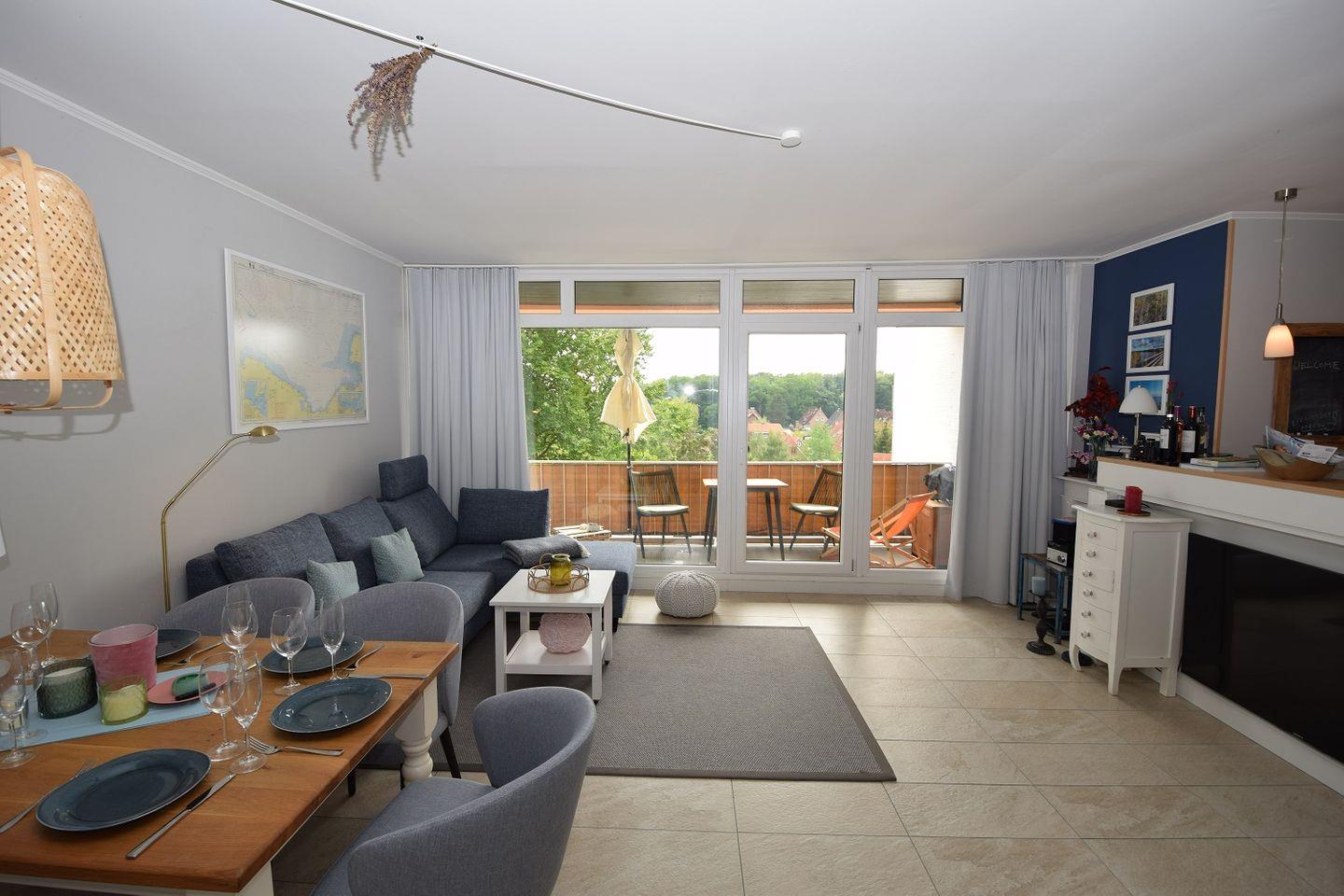 Das Wohnzimmer mit Zugang zum schönen Südbalkon verfügt über eine große Fensterfront, welche für viel Licht und Luft im Raum sorgt. Es bietet viel Platz zum gemeinsamen Verweilen und Erholen. Vom Balkon und aus dem Schlafzimmer Fenster haben Sie Blick auf die Ostsee.