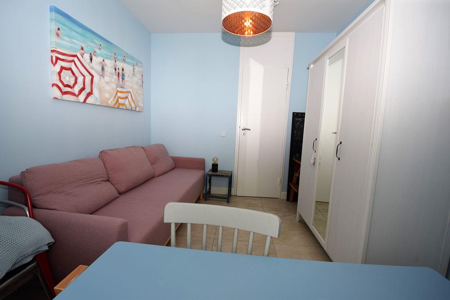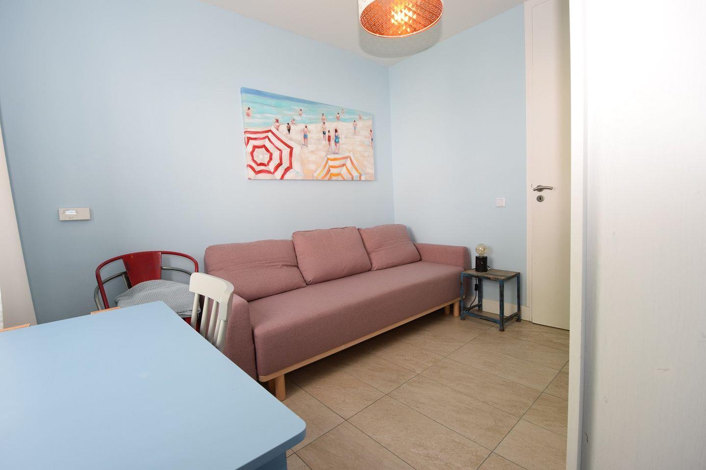 Im Wohnzimmer kann bei Bedarf noch eine 5. Person auf dem Sofa übernachten.