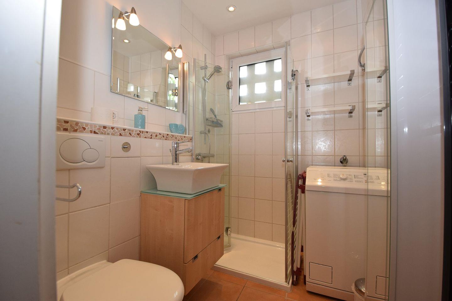 Ein Badezimmer in modernen Fliesendesign, Duschwanne und Waschmaschine sorgen dafür, dass das Badezimmer alle Wünsche erfüllt. Selbstverständlich gehören auch ein beleuchteter Spiegel, Waschtisch und WC zur Badezimmerausstattung.