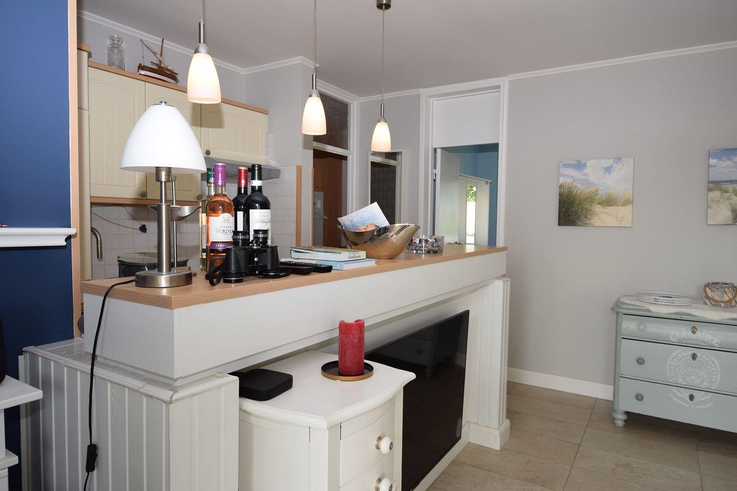 Zu diesem hin offen gestaltet ist die moderne Küchenzeile mit Backofen, Ceranherd, Spülmaschine und Kühlschrank. Kaffeemaschine sowie Wasserkocher und Toaster sorgen zudem für einen guten Start in den Urlaubstag.