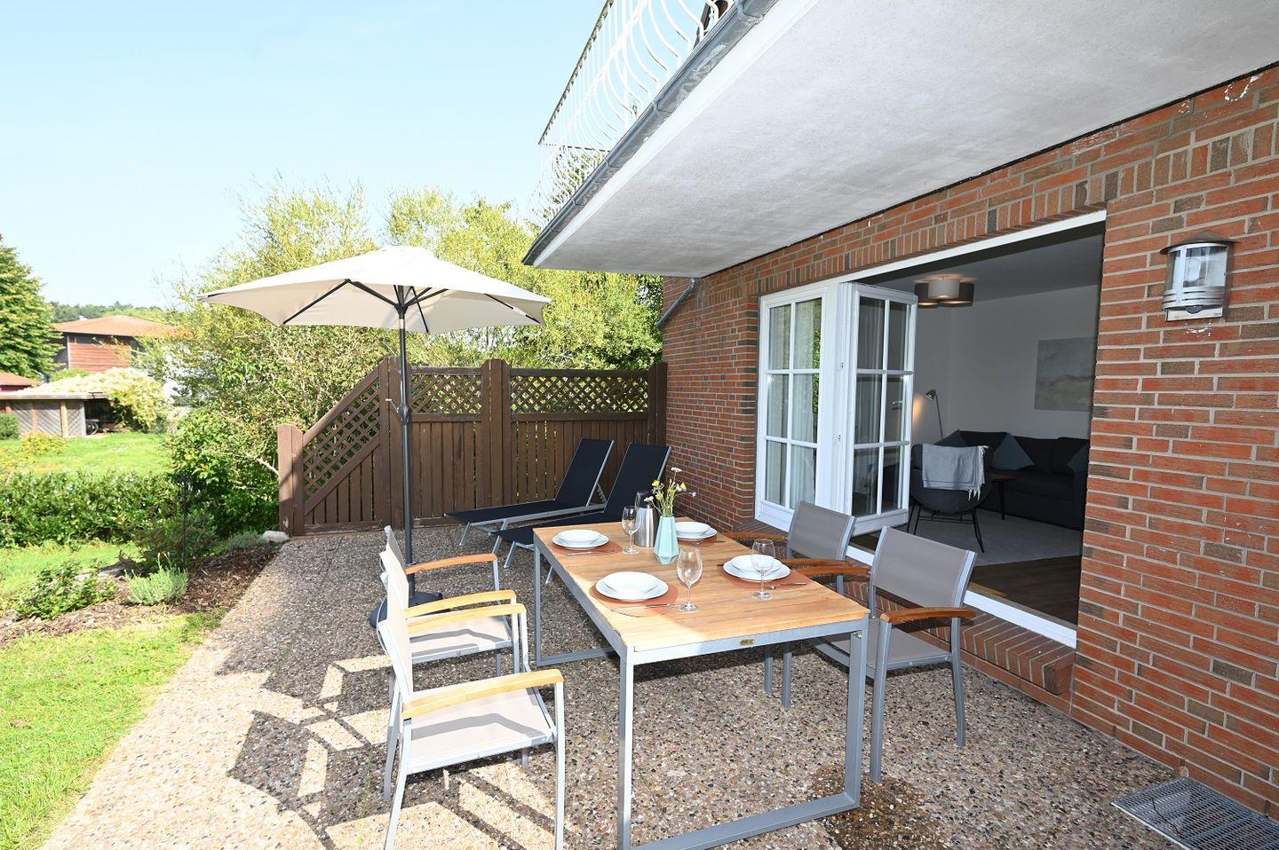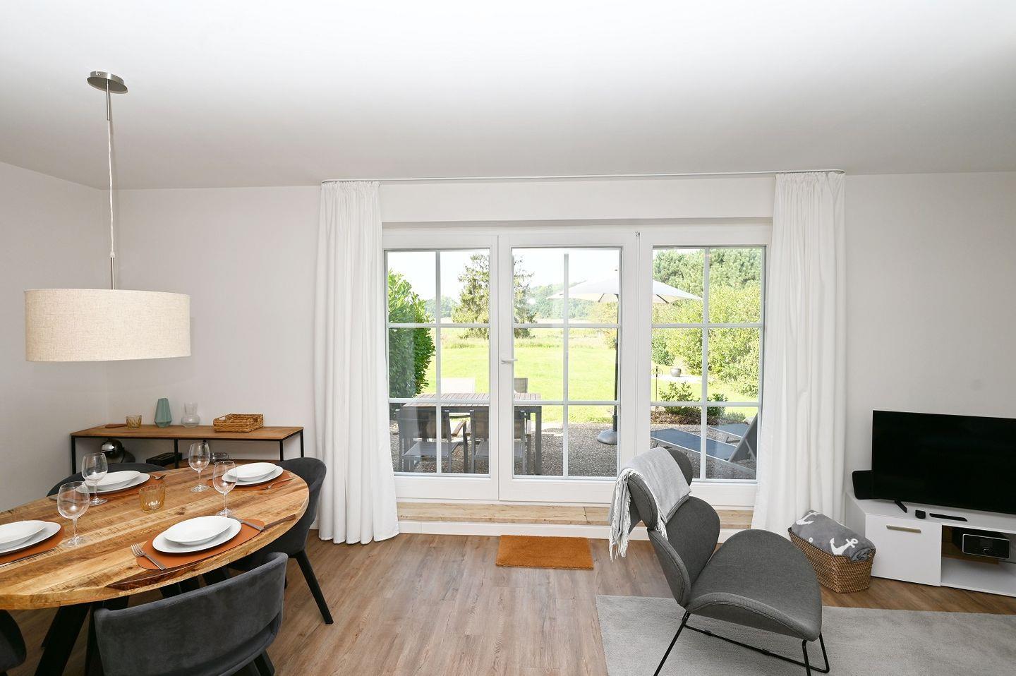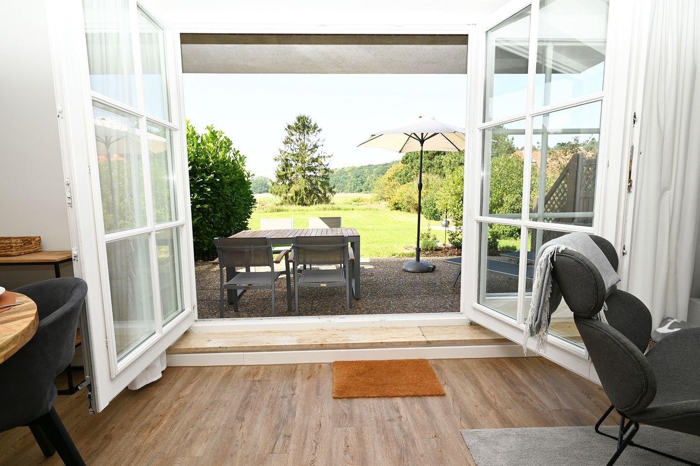 Genießen Sie eine lichtdurchflutete Ferienwohnung mit großer Terrasse und traumhaftem Blick auf Salzwiesen und Wald in Hohwacht.