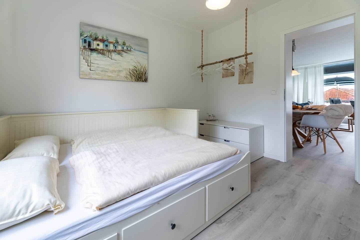 Insgesamt zwei Schlafzimmer sorgen für erholsame Nächte. Ein Doppelschlafzimmer mit Boxspringbett (180x200 cm) sowie ein weiteres Schlafzimmer mit einem Schubkastenbett. Zieht man dieses aus verfügt man in dem 2. Schlafzimmer auch über Doppelbett (160x200 cm)