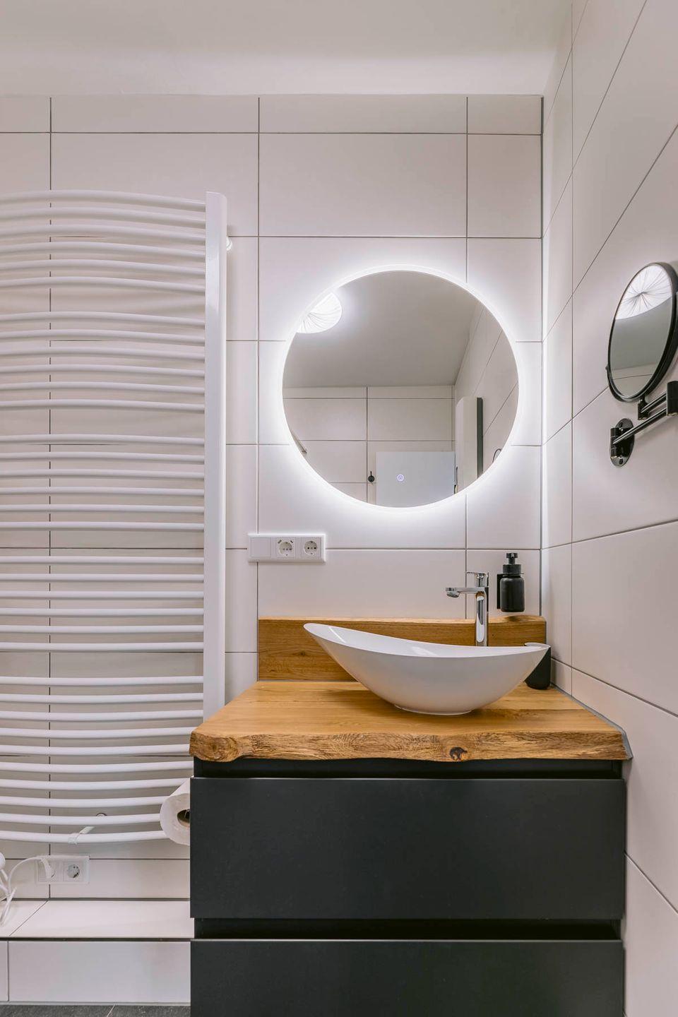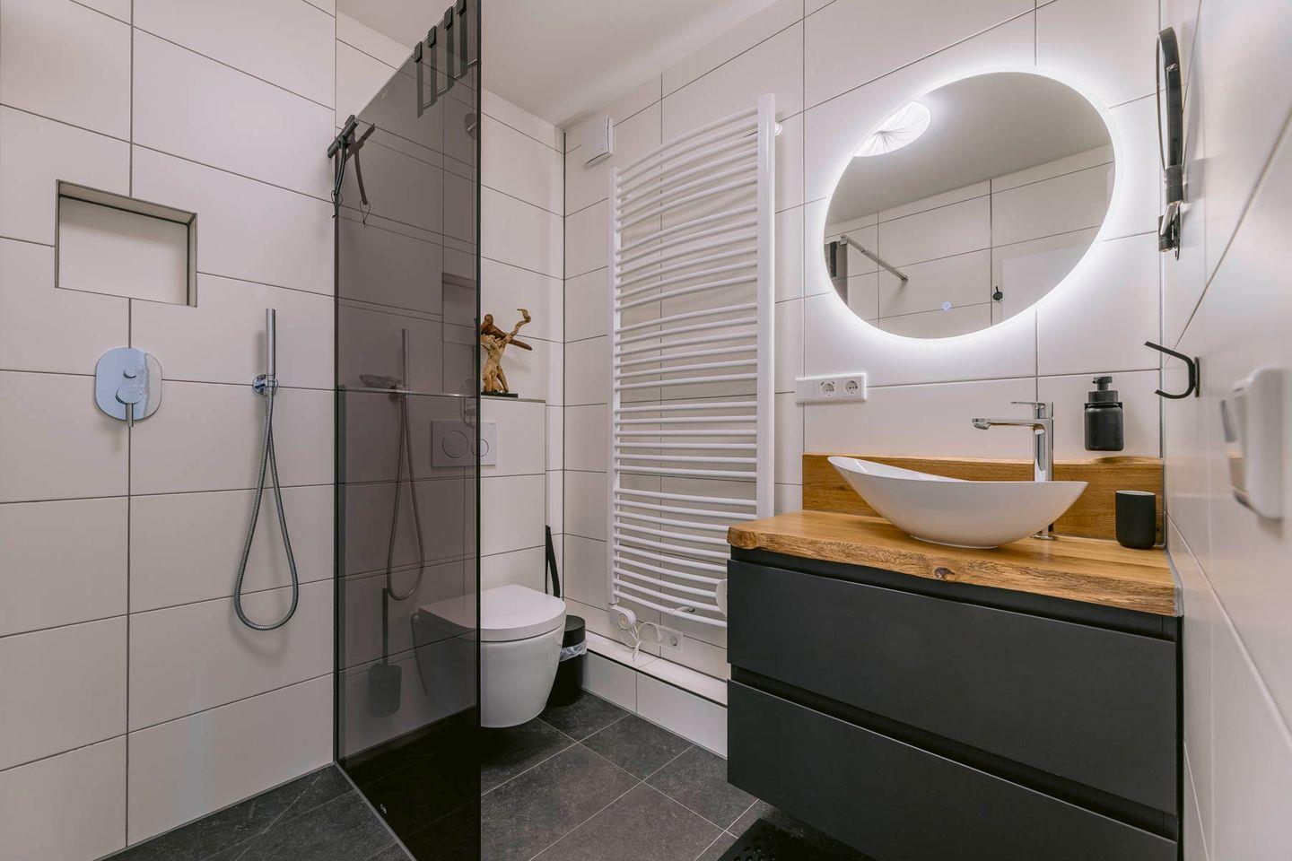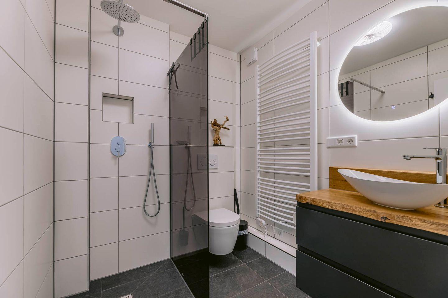 Ein Badezimmer in Fliesendesign mit Dusche, beleuchteten Spiegel, Waschbecken und reichlich Stauraum sorgen dafür, dass das Badezimmer alle Wünsche erfüllt.
