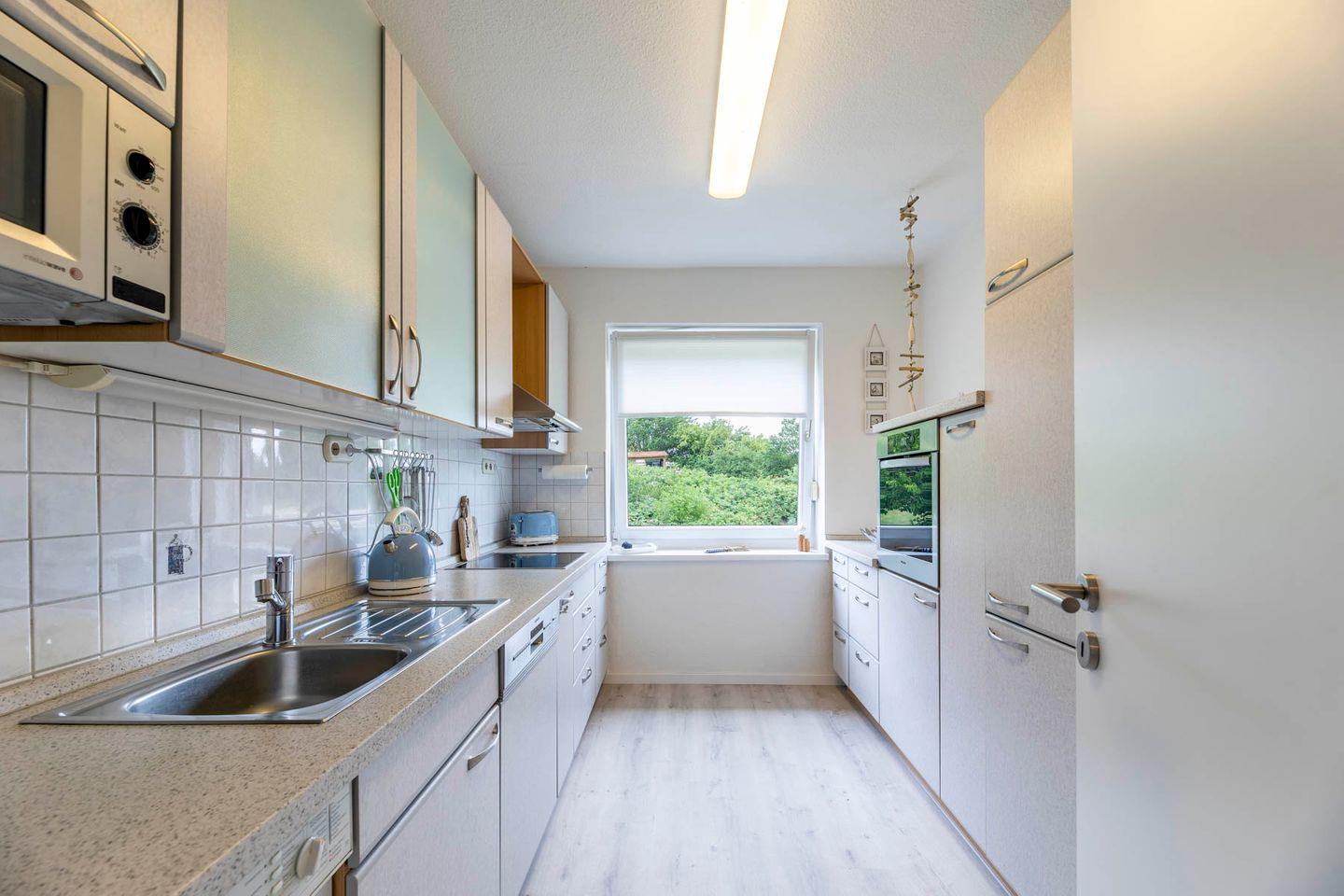 In einem separaten Raum finden Sie die große Küche. Diese ist mit einem Ceran-Kochfeld, Mikrowelle, Backofen, Airfryer Wasserkocher, Kaffeemaschine, Toaster, Thermomix TM6 und einem großen Kühlschrank mit Gefriefach ausgestattet. Um den Komfort vollständig abzurunden befindet sich eine Spülmaschine in der Küche. All dies sorgt für einen guten Start in den Urlaubstag. Des weiteren finden Sie auch eine Waschmaschine in der Küche vor.