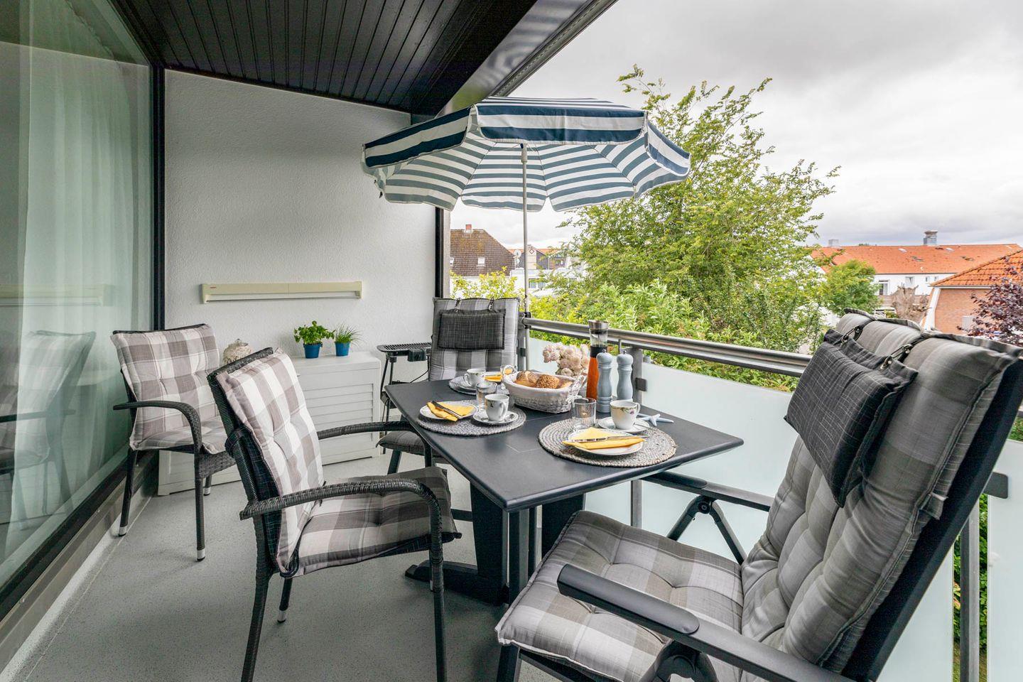 Der nach Süden ausgerichtete Balkon der Unterkunft ist nicht nur besonders sonnig, sondern durch seine komplette Überdachung auch bei schlechteren Wetterverhältnissen gut nutzbar. Balkonmöbel laden zum Verweilen ein.