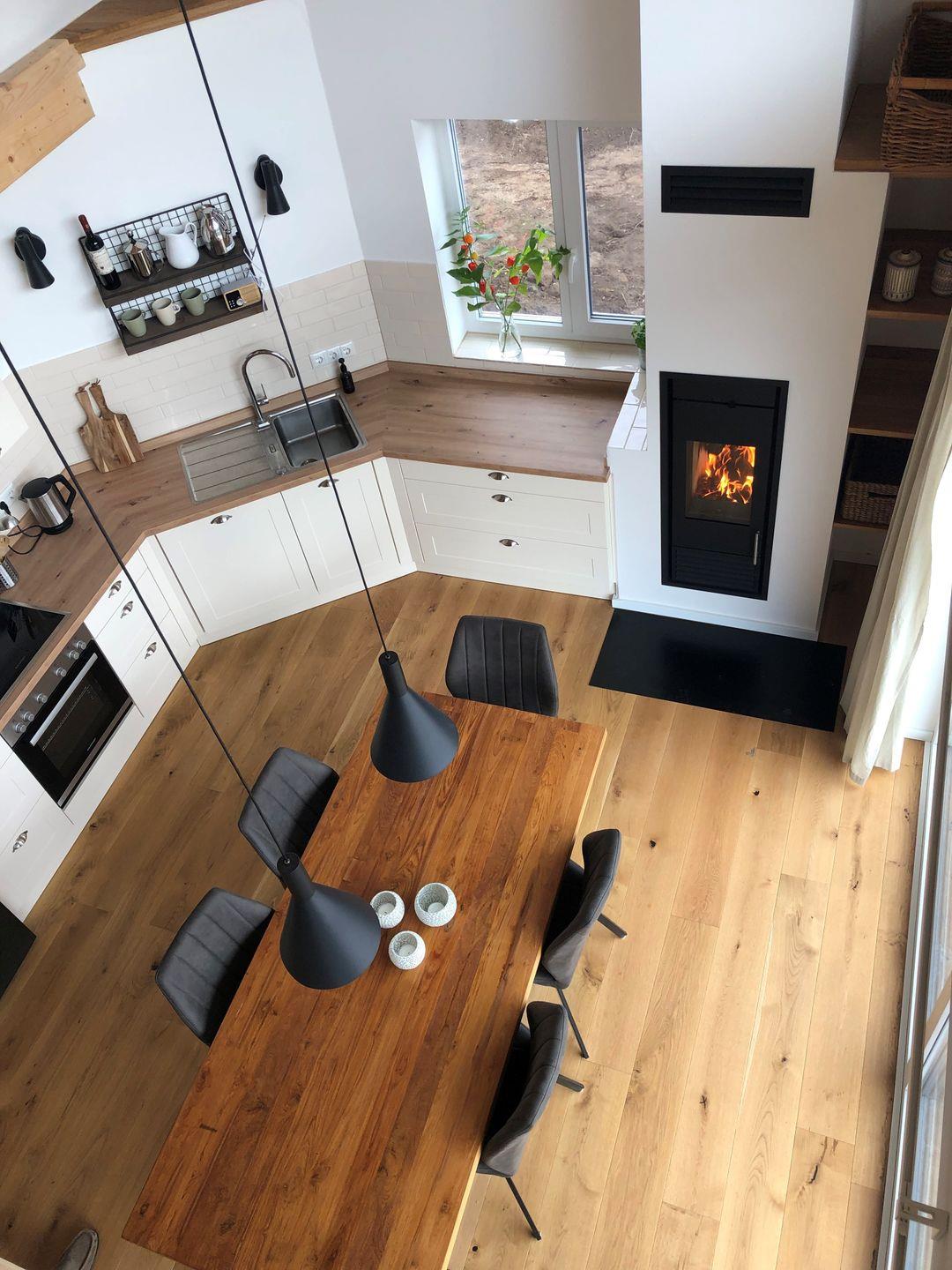 Auf der rechten Seite öffnet sich der großzügige, offene Wohn– und Essbereich mit Einbauküche. Durch die großen Panoramafenster mit Schiebetür zur Terrasse ist der ganze Bereich lichtdurchflutet und bietet einen herrlichen Blick in die Natur. Ein Highlight ist die offene Decke über dem Essbereich mit Sicht auf die Galerie und die Dachschrägen. Ein Kamin schafft an den Abenden oder in der kühleren Jahreszeit zusätzliche Gemütlichkeit.