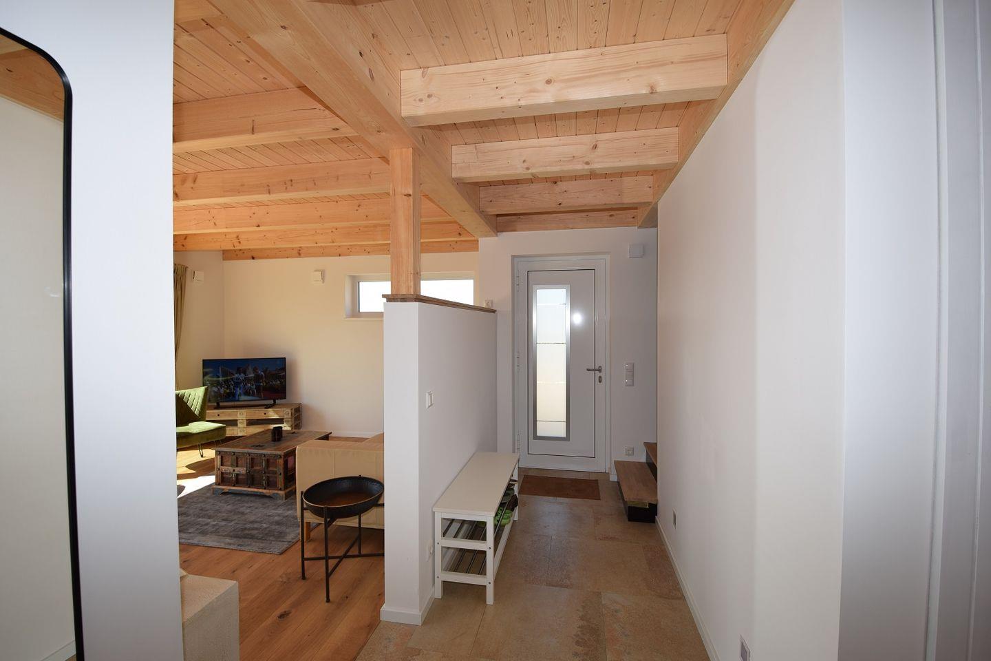 Der Charakter des im Jahr 2022 fertiggestellten Architektenhauses wird durch Holz geprägt: Die sichtbaren Deckenbalken und das echte Eichenparkett in den Wohn – und Schlafräumen schaffen eine gemütlich hochwertige Wohnatmosphäre. Eine gemütliche und geräumige Sauna rundet das Ganze noch ab.