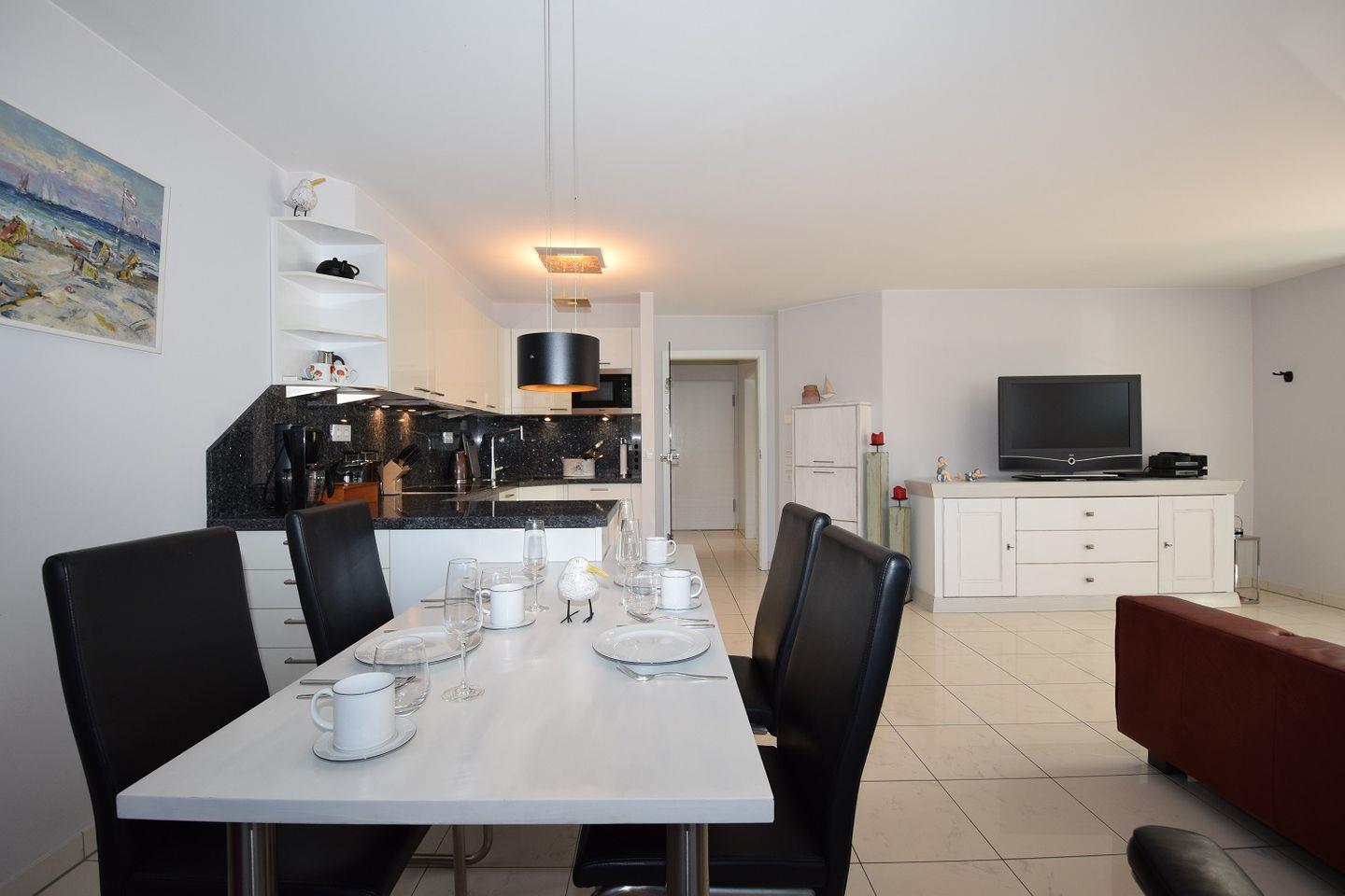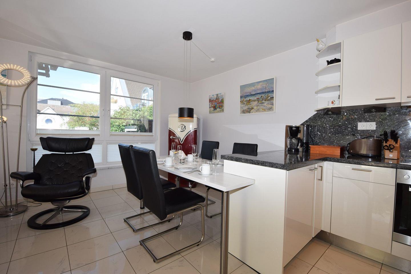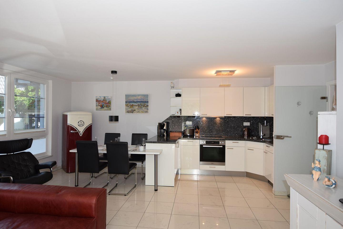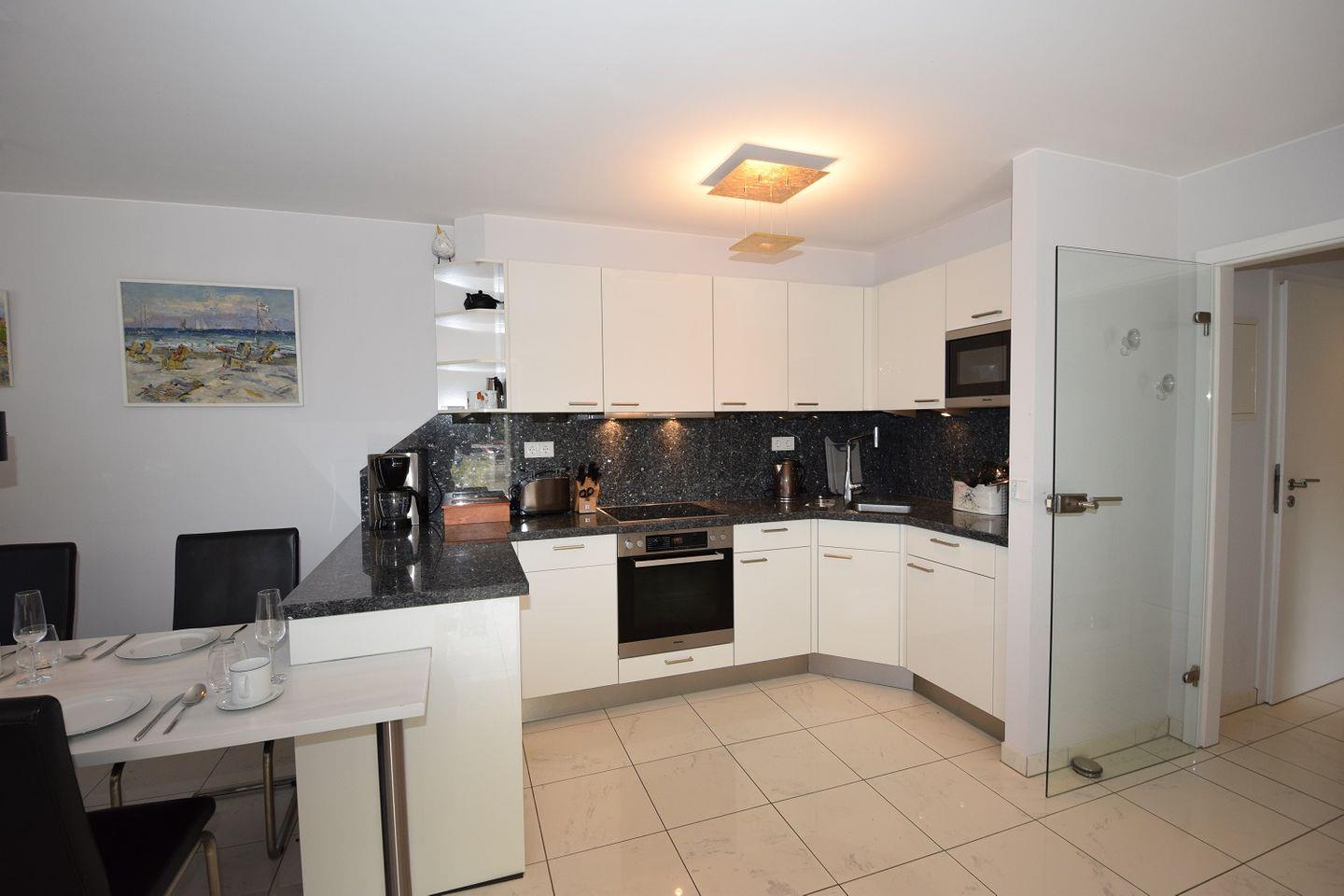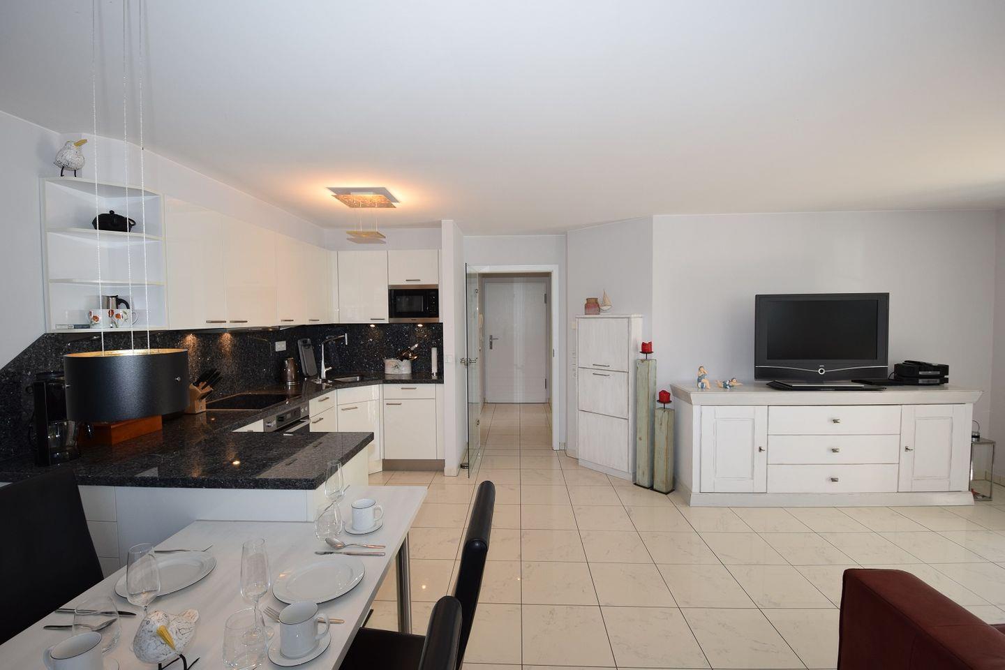 Der helle Wohnraum mit großen Fensterfronten und Zugang zum schönen Balkon teilt sich in einen Wohnbereich und die Essecke mit angrenzender Küchenzeile. Die Küche ist modern und offen gestalte. So finden sich hier neben einem Geschirrspüler auch Herd und Backofen, Kühlschrank mit Gefriermöglichkeit und zahlreiche weitere Küchenutensilien. Ein Toaster, eine Kaffeemaschine, eine Mikrowelle sowie ein Wasserkocher sind ebenfalls zu finden.