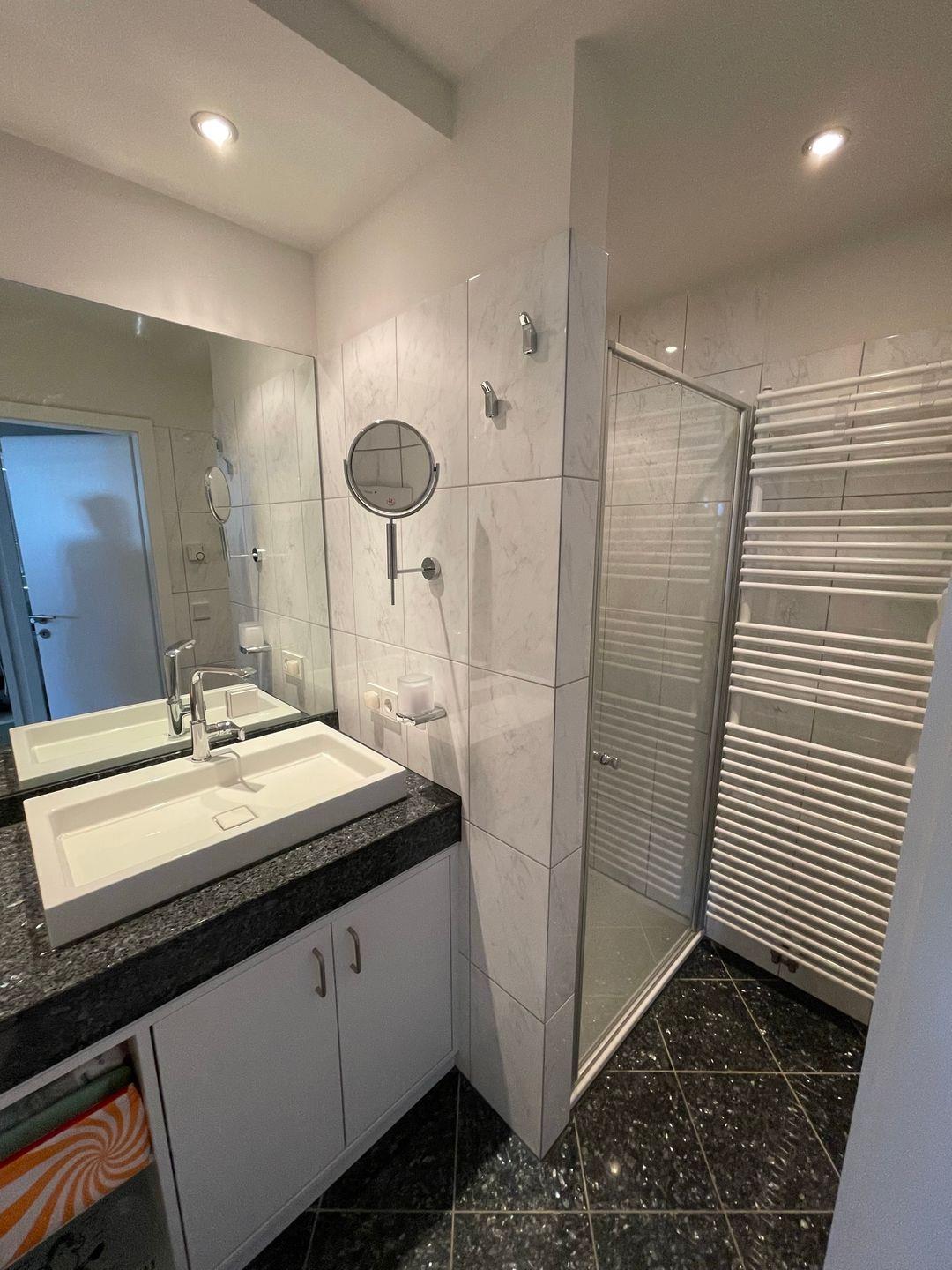 Das Badezimmer mit Dusche ist gefliest und modern ausgestattet. Die Dusche ist bodentief (lediglich kleine Kante). Der Waschtisch mit großem Spiegel wird ebenso wie der Rest des Raumes von Deckenspots beleuchtet und bietet reichlich Staufläche. Ein Föhn ist hier ebenso vorhanden wie ein Handtuchwärmer, sodass das Bad keine Wünsche offenlässt.