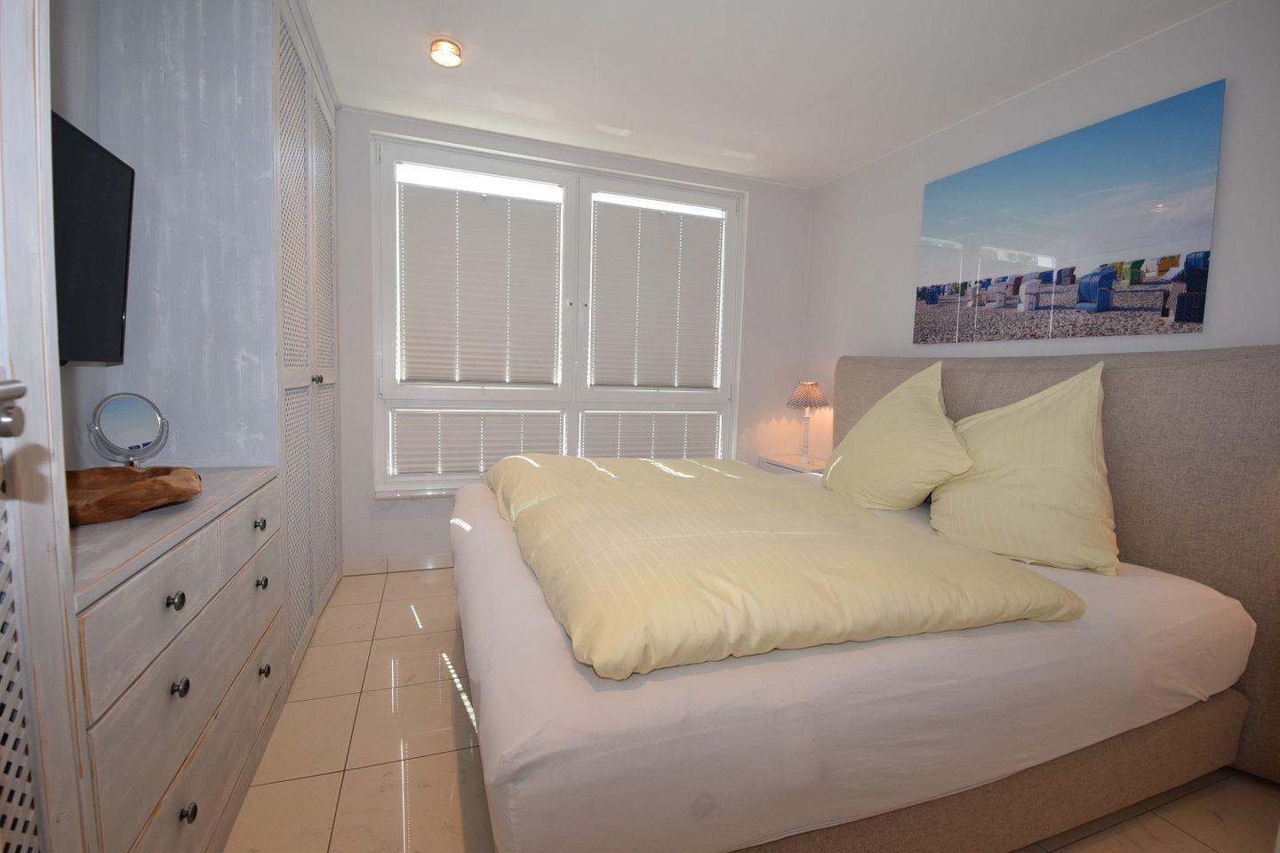 Das Schlafzimmer ist mit einem großen Doppelbett und ideal für nächtlichen Komfort eingerichtet. Ein Kleiderschrank sowie Kommoden runden die Einrichtung des Zimmers ab. In dem Schlafzimmer befindet sich zudem ein Fernseher.
