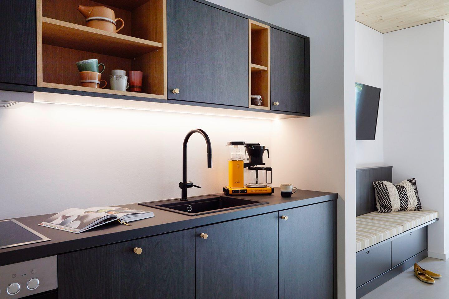Die Ferienwohnung hat kostenloses schnelles WLAN, einen Smart-TV, eine komplette Küchenausstattung. Die Inneneinrichtung vereint natürliche Materialien, wunderschöne Farbtöne und zeitloses Design im modernen Cottage-Stil. Eine dunkle Küche mit Farbakzenten gibt der Wohnung den gewissen Charme. Ebenfalls ist das Apartment Smarthome-ready ausgestattet, inkl. der Heizung. Ein intelligentes Schließsystem vereinfacht den Zugang über einen individuellen Code und verbessert die Sicherheit. Jedes Apartment verfügt außerdem über zusätzlichen Stauraum im Keller (inkl. Fahrradkeller, Ladestationen für E-Bikes uvm.). Auch Waschmaschinen befinden sich im Keller und können kostenlos genutzt werden.