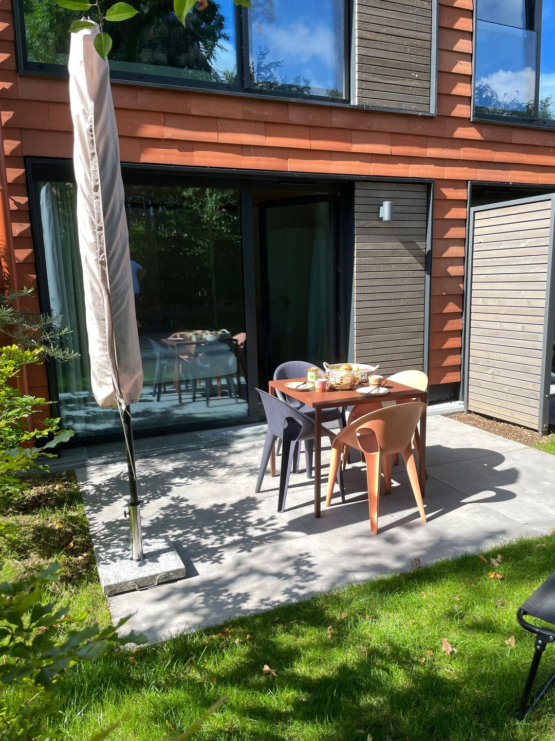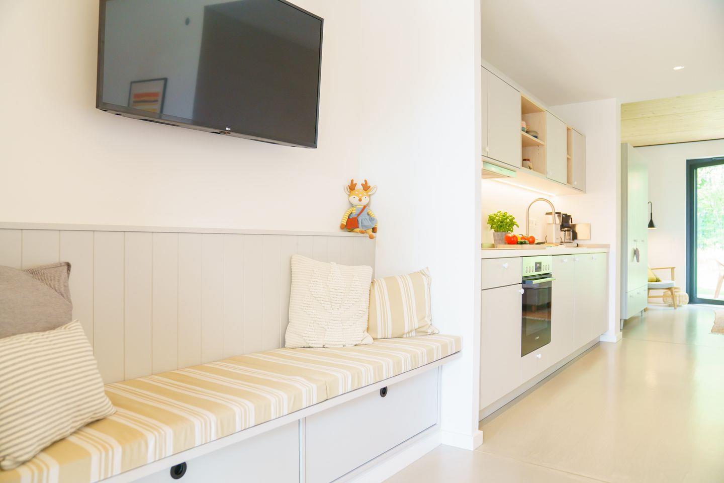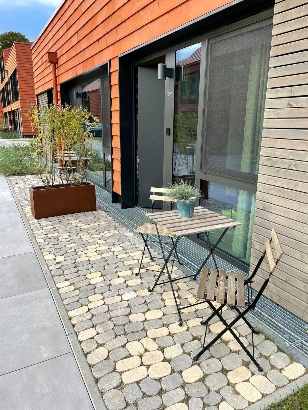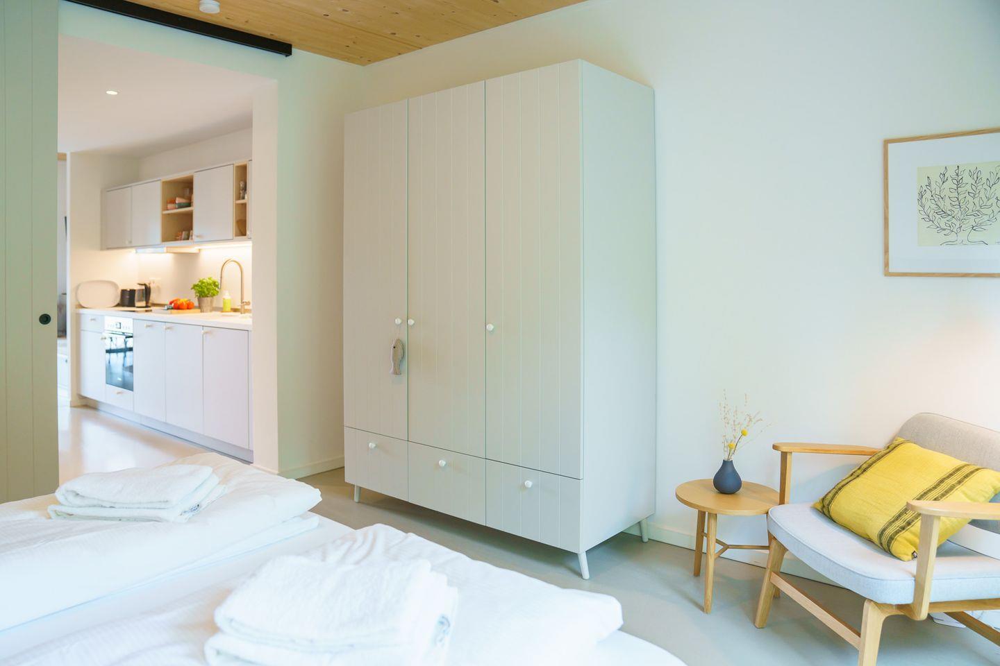Die Ferienwohnung hat kostenloses schnelles WLAN, einen Smart-TV, eine komplette Küchenausstattung. Die Inneneinrichtung vereint natürliche Materialien, wunderschöne Farbtöne und zeitloses Design im modernen Cottage-Stil. Eine dunkle Küche mit Farbakzenten gibt der Wohnung den gewissen Charme. Ebenfalls ist das Apartment Smarthome-ready ausgestattet, inkl. der Heizung. Ein intelligentes Schließsystem vereinfacht den Zugang über einen individuellen Code und verbessert die Sicherheit. Jedes Apartment verfügt außerdem über zusätzlichen Stauraum im Keller (inkl. Fahrradkeller, Ladestationen für E-Bikes uvm.). Auch Waschmaschinen befinden sich im Keller und können kostenlos genutzt werden.