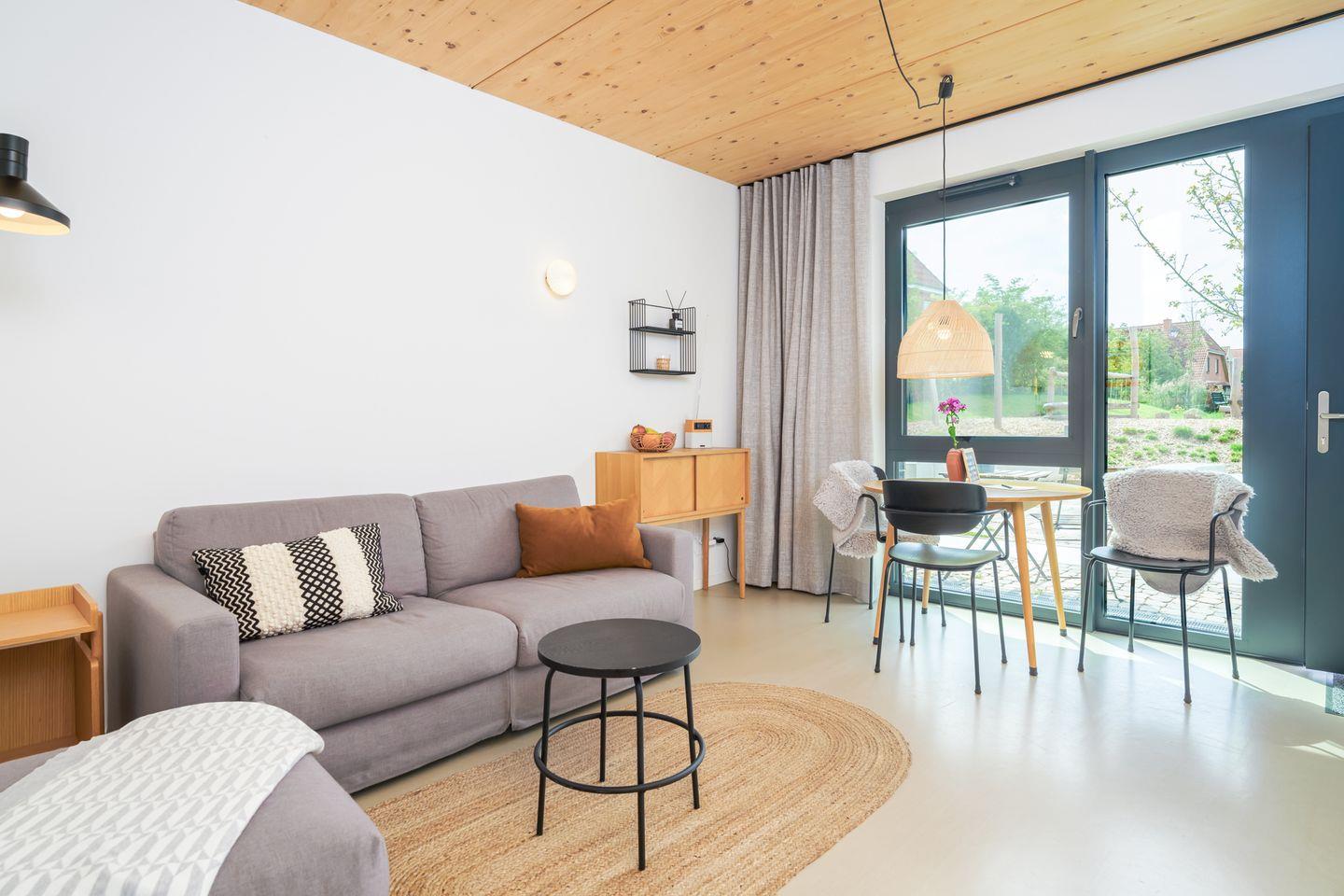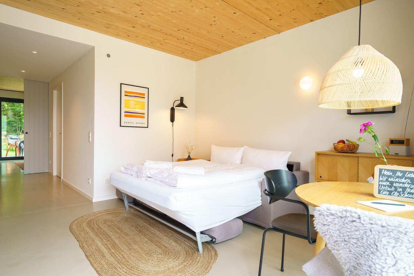 Diese charmante Ferienwohnung für den Urlaub zu zweit, zu dritt oder zu viert bietet mit ihren 58 Quadratmetern ein angenehmes Wohngefühl und eine hochwertige, komfortable Ausstattung. Das Apartment verfügt über einen gemütlichen Wohn- und Essbereich, ein Schlafzimmer und eine geräumige offene Küche. Das Sofa im Wohnbereich kann zu einem bequemen Schlafplatz für 2 weitere Personen umfunktioniert werden.