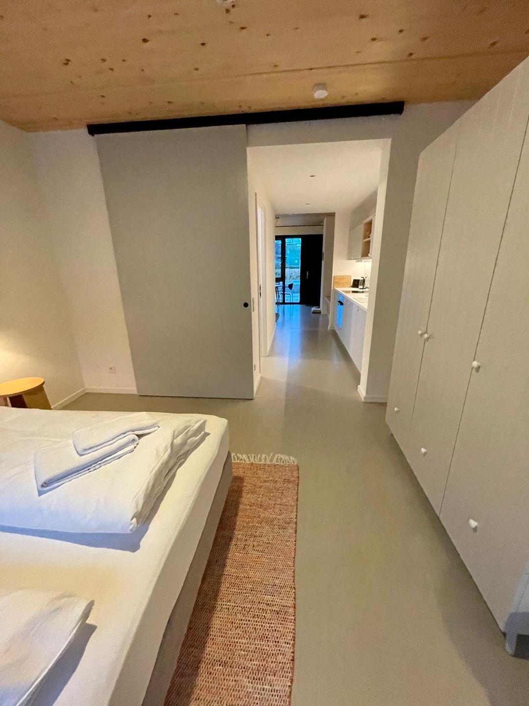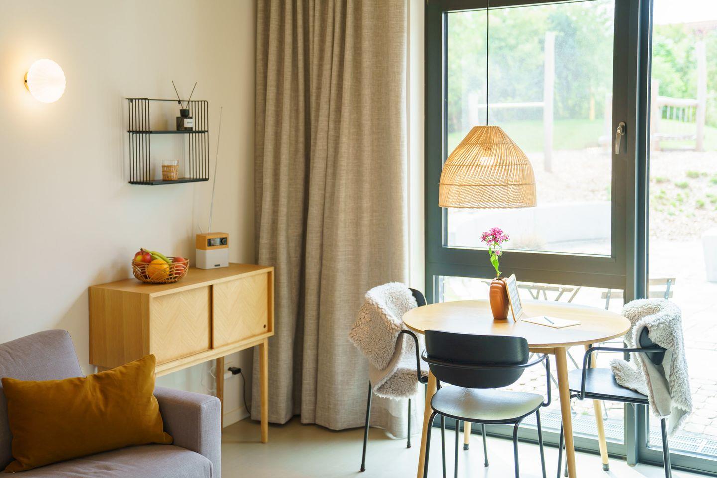 Hier zeigen wir Euch unsere charmante Ferienwohnung für den Urlaub zu zweit, zu dritt oder zu viert. Mit ihren 58 m2 bietet diese Wohnung ein angenehmes Wohngefühl und eine hochwertige, komfortable Ausstattung. Hier fehlt es euch an nichts. Das Apartment verfügt über einen gemütlichen Wohn- und Essbereich, ein Schlafzimmer und eine geräumige offene Küche. Das Sofa im Wohnbereich kann zu einem bequemen Schlafplatz für 2 weitere Personen umfunktioniert werden. Außerdem gibt es ein modernes Badezimmer mit Dusche und WC, einen Abstellraum im Untergeschoss und eine große Terrasse mit Blick ins Grüne.