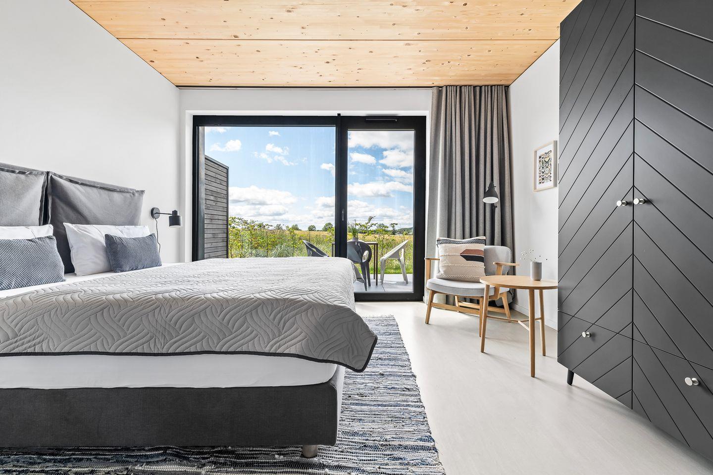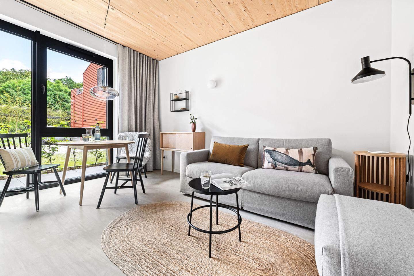 Diese charmante Ferienwohnung für den Urlaub zu zweit, zu dritt oder zu viert bietet mit ihren 58 Quadratmetern ein angenehmes Wohngefühl und eine hochwertige, komfortable Ausstattung. Das Apartment verfügt über einen gemütlichen Wohn- und Essbereich, ein Schlafzimmer und eine geräumige offene Küche. Das Sofa im Wohnbereich kann zu einem bequemen Schlafplatz für 2 weitere Personen umfunktioniert werden.