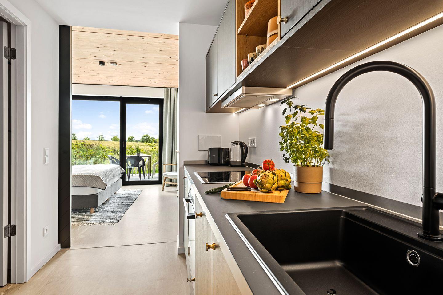 Die Ferienwohnung hat kostenloses schnelles WLAN, einen Smart-TV, eine komplette Küchenausstattung. Die Inneneinrichtung vereint natürliche Materialien, wunderschöne Farbtöne und zeitloses Design im modernen Cottage-Stil. Eine dunkle Küche mit Farbakzenten gibt der Wohnung den gewissen Charme. Ebenfalls ist das Apartment Smarthome-ready ausgestattet, inkl. der Heizung. Ein intelligentes Schließsystem vereinfacht den Zugang über einen individuellen Code und verbessert die Sicherheit. Jedes Apartment verfügt außerdem über zusätzlichen Stauraum im Keller (inkl. Fahrradkeller, Ladestationen für E-Bikes uvm.). Auch Waschmaschinen befinden sich im Keller und können kostenlos genutzt werden.