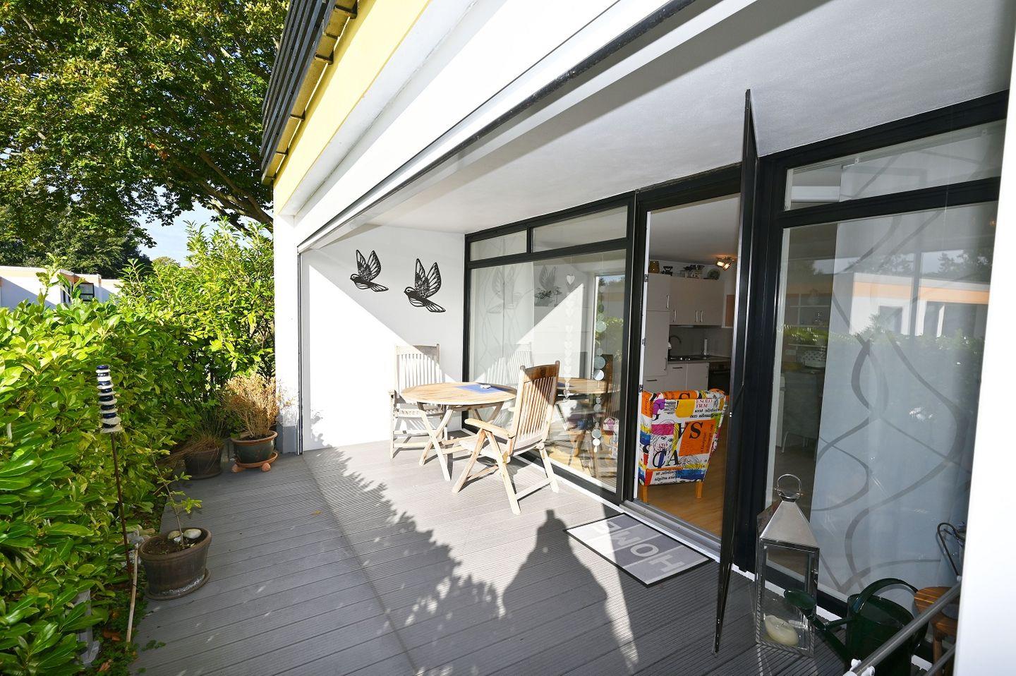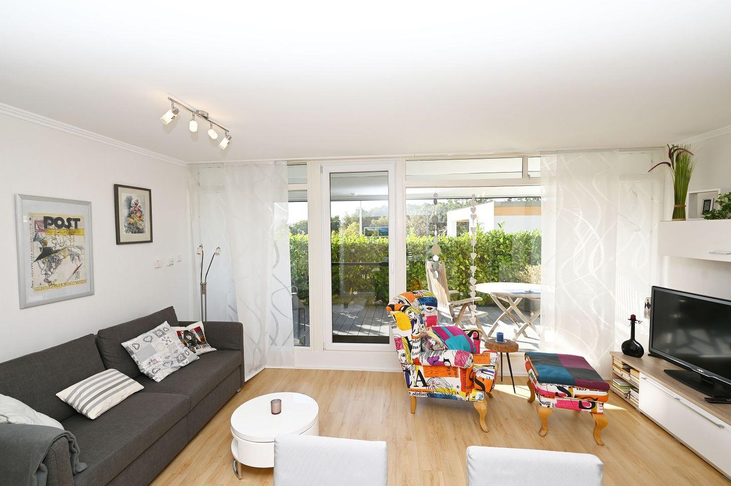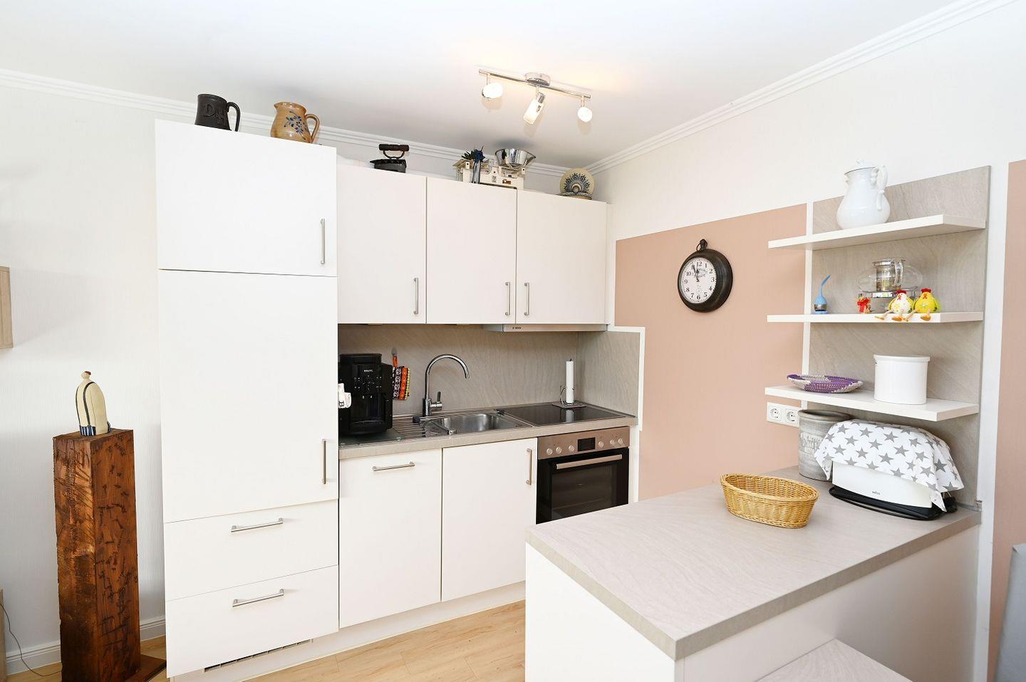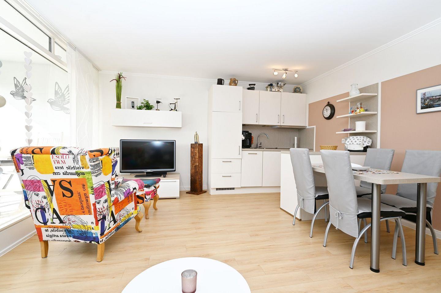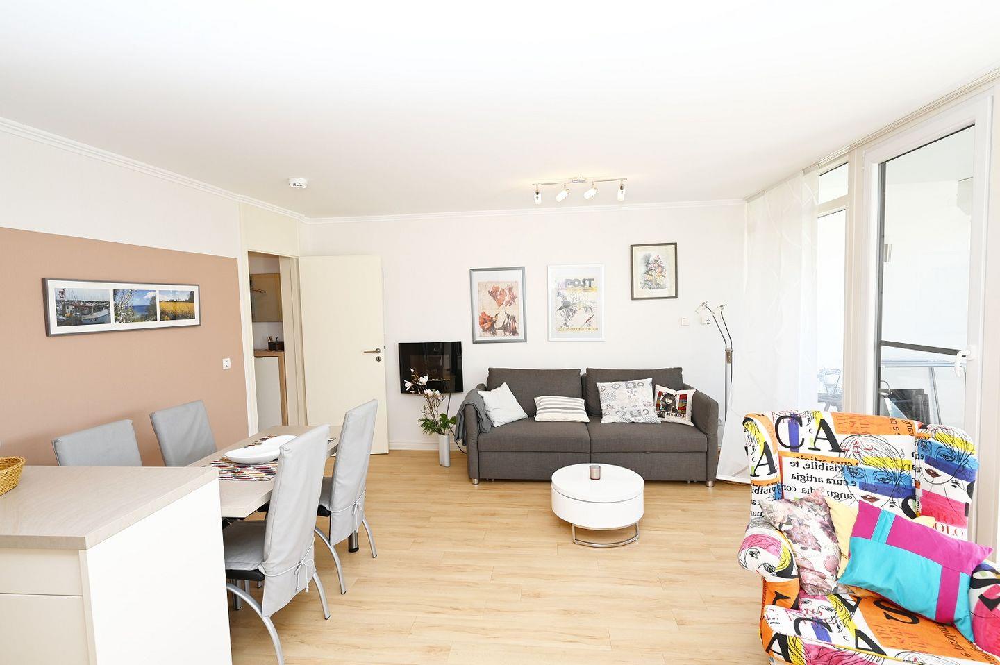 Das Herzstück der Ferienwohnung bildet der offene und lichtdurchflutete Wohn- und Essbereich mit einer voll ausgestatteten offenen Küche. Große Glasfronten schaffen eine einladende Atmosphäre und führen Sie direkt auf die herrliche Terrasse, wo Sie die Sonne und das maritime Flair der Ostsee in vollen Zügen genießen können.