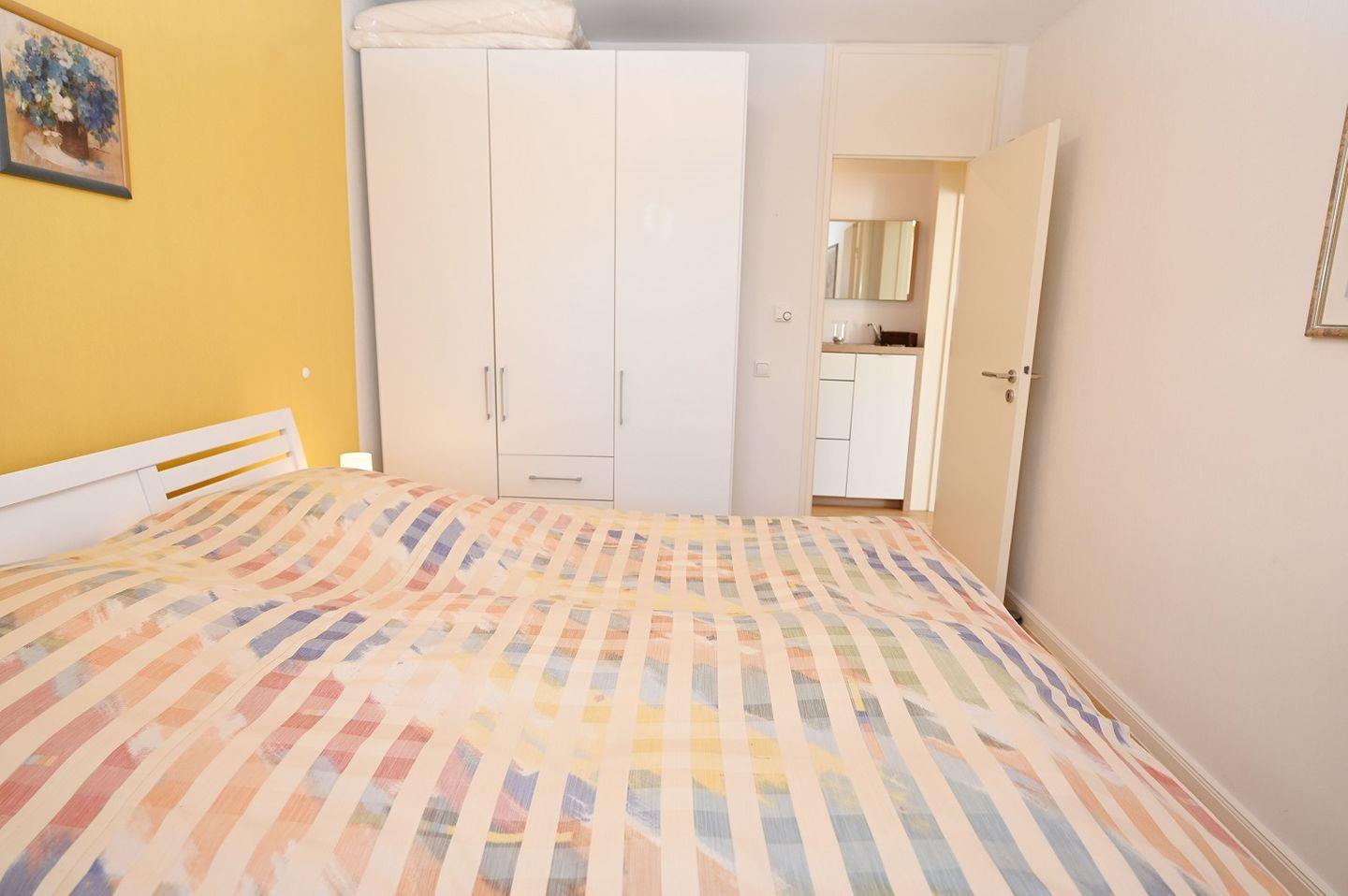 Das Schlafzimmer empfängt Sie mit einem großzügigen Doppelbett, dessen offenes Fußende viel Komfort bietet. Zudem ist das Bett erhöht, was den Ein- und Ausstieg wesentlich erleichtert. Die geschmackvolle Einrichtung schafft eine behagliche Atmosphäre für erholsame Nächte.