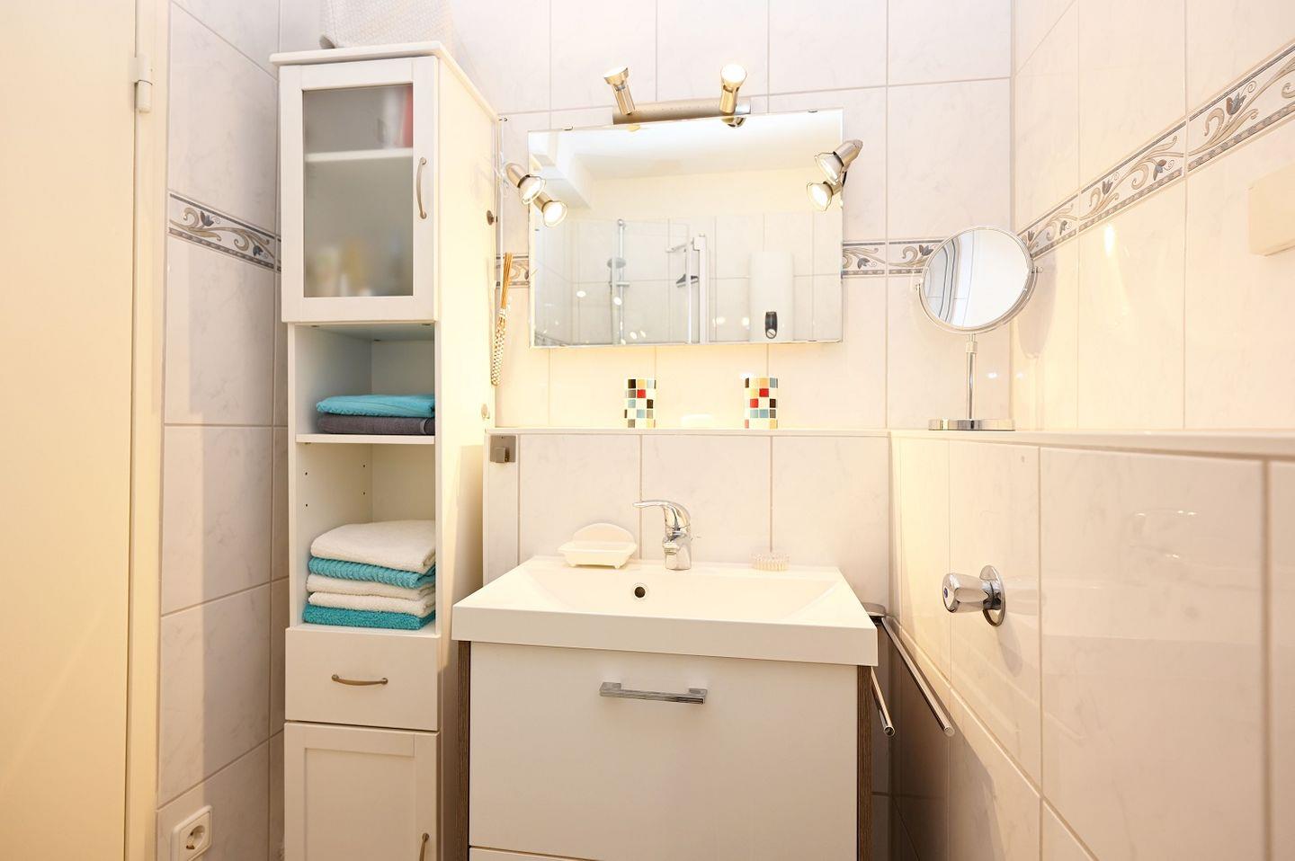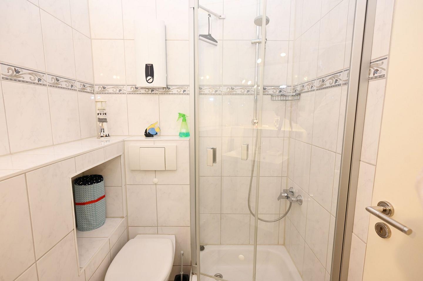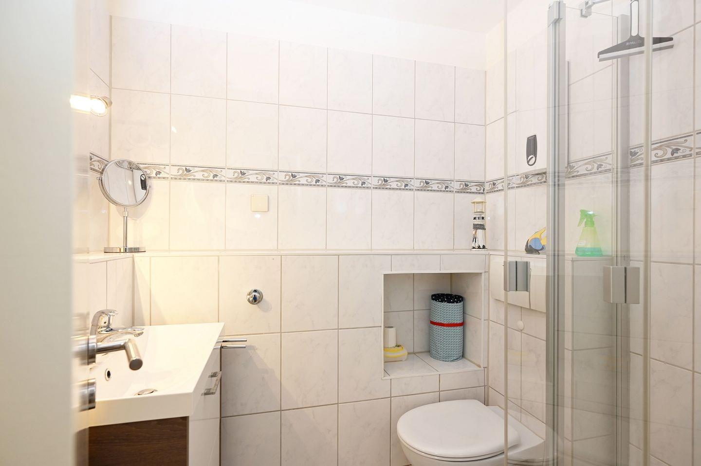 Das angrenzende Badezimmer verfügt über eine Dusche mit Duschwanne, WC, Waschbecken mit Spiegel und einem Kosmetikspiegel.