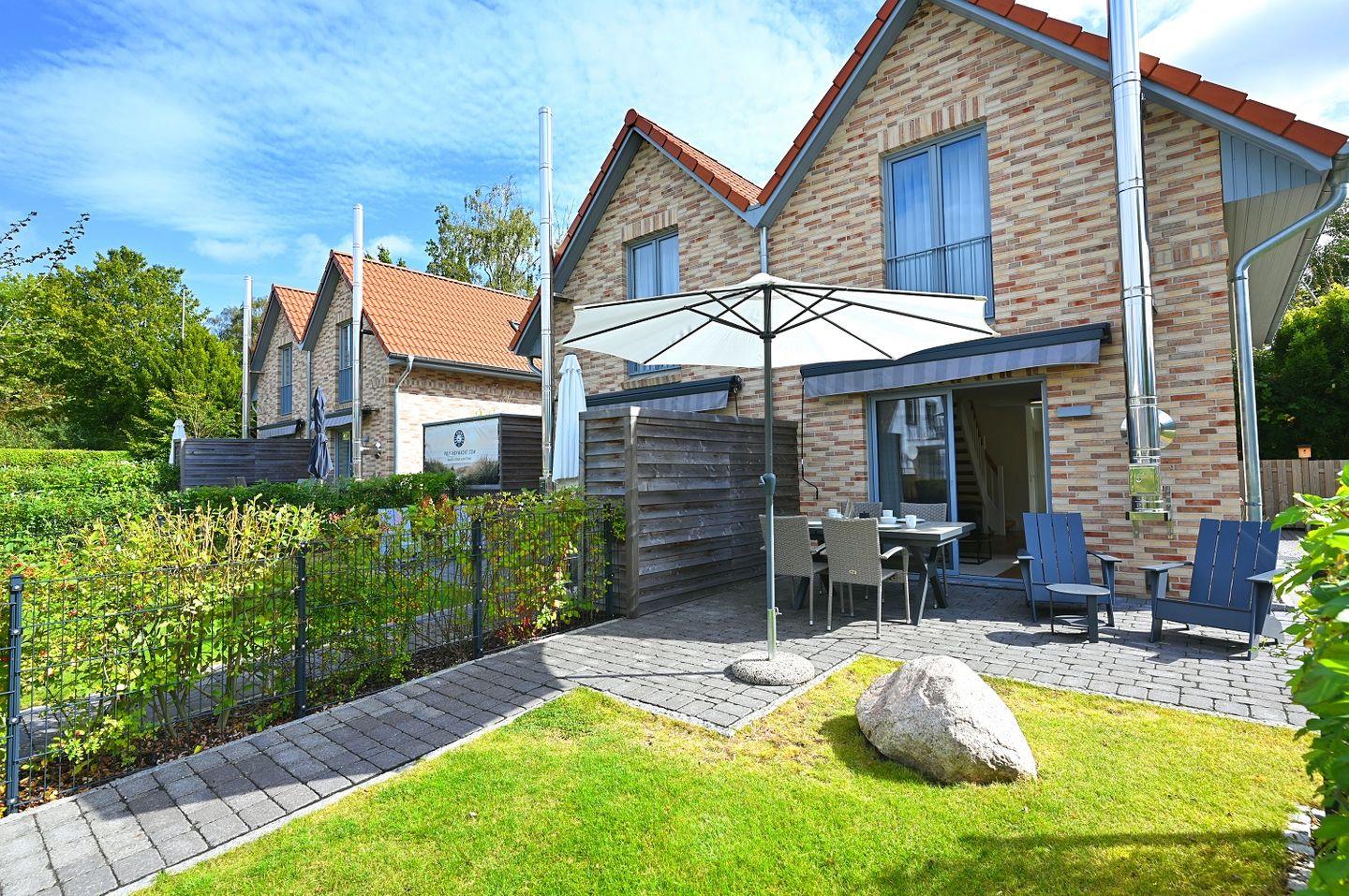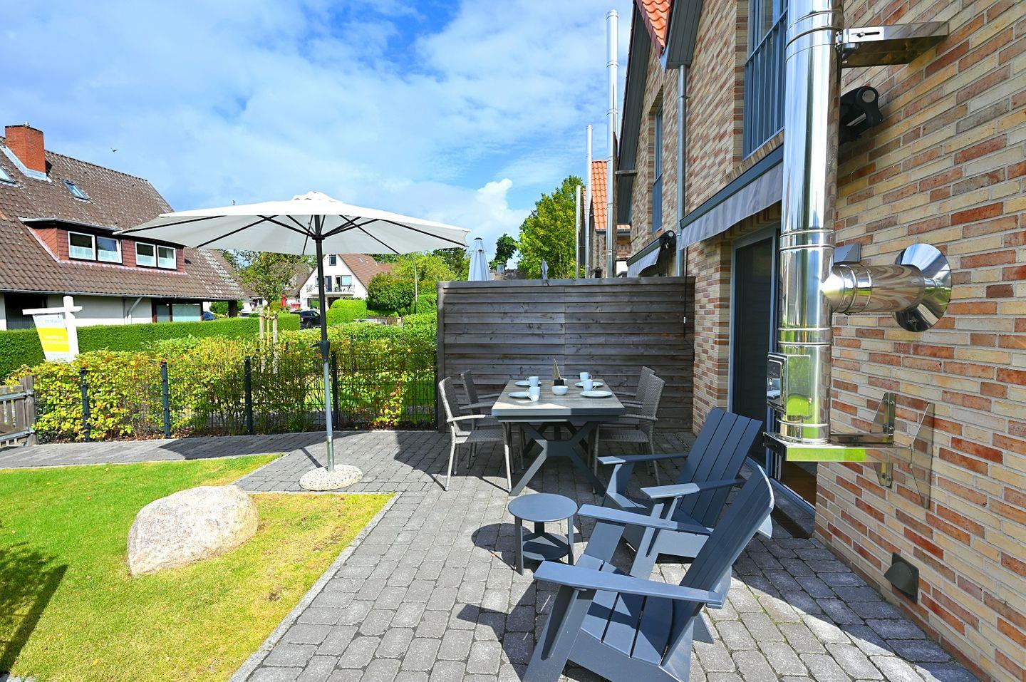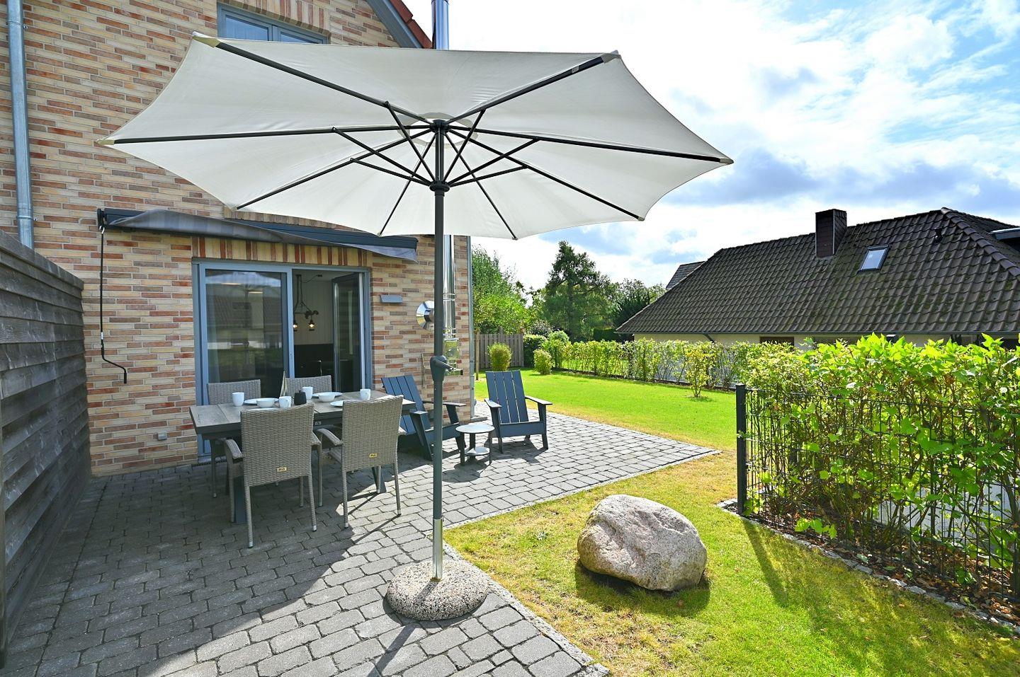 Der Außenbereich lädt zu entspannten Stunden ein: Auf der Terrasse mit bequemen Loungemöbeln kannst du bei einem Cocktail den Tag ausklingen lassen und vielleicht sogar das Meeresrauschen hören. Der Garten bietet Platz zum Chillen und Spielen.