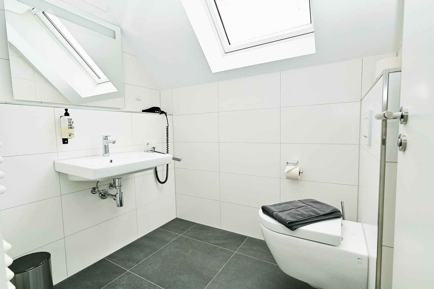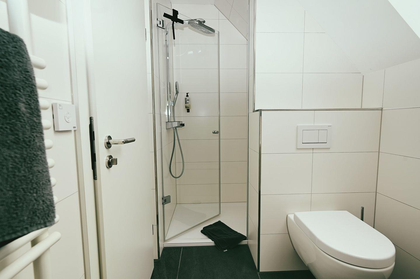 Das Badezimmer im ersten Stock verwöhnt dich mit einer luxuriösen XL-Regendusche. Für zusätzlichen Komfort gibt es im Erdgeschoss ein Gäste-WC.