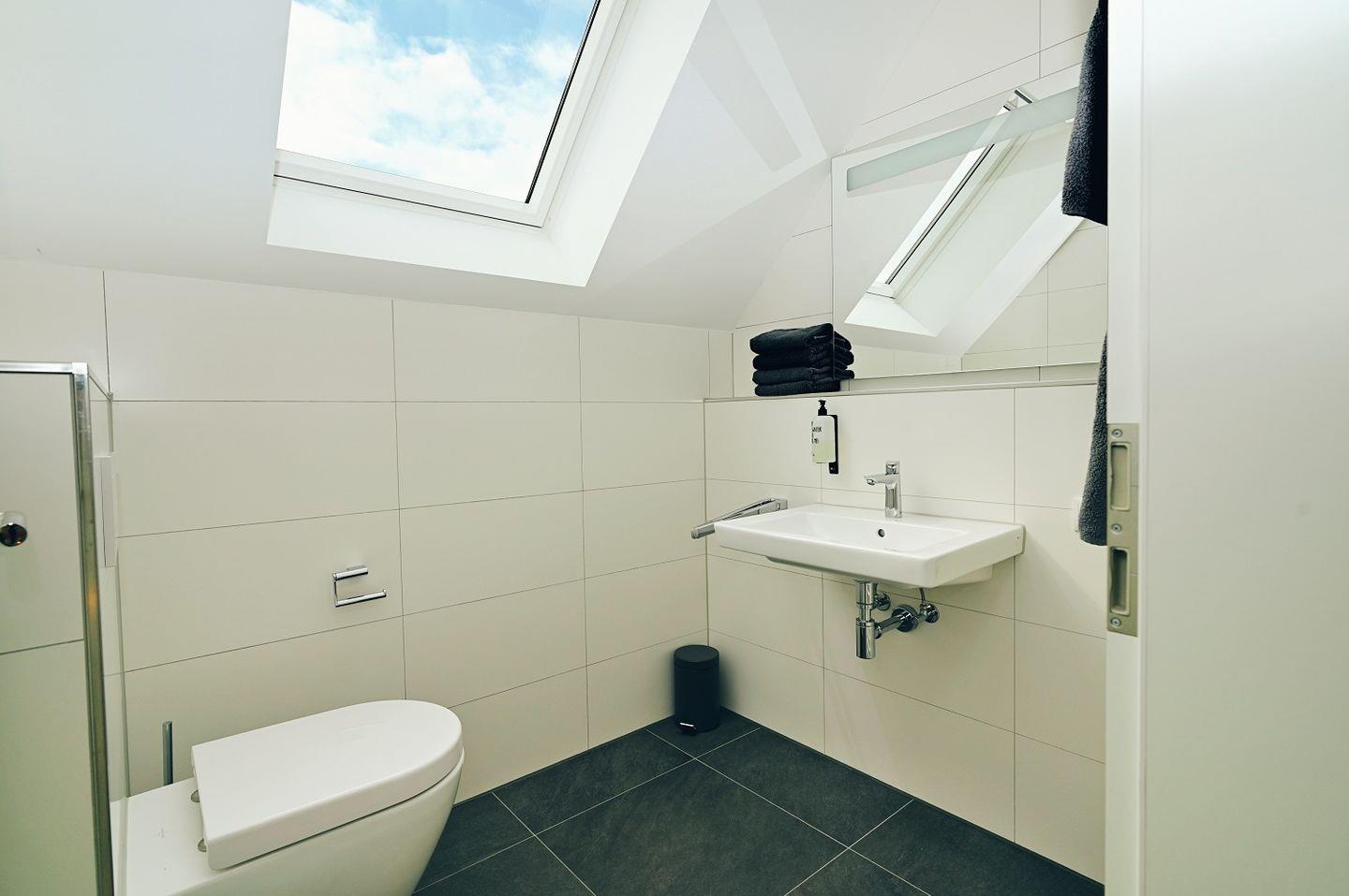 Das Badezimmer im Obergeschoss punktet mit einer großzügigen XL-Regendusche für ein
