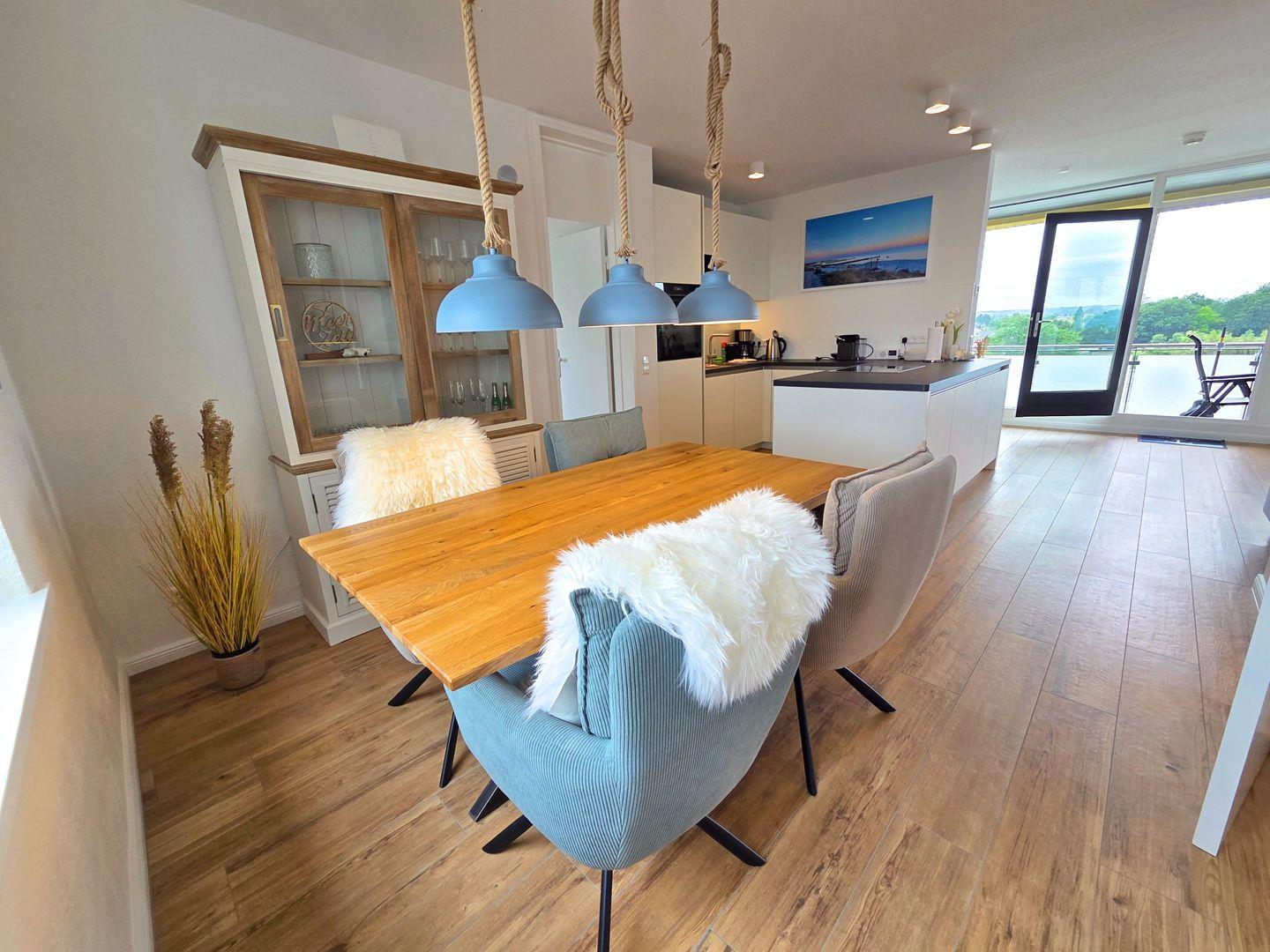 Der offen zum Wohnzimmer gestaltete Küchenbereich ist vollständig ausgestattet und bietet unter anderem eine Induktionskochstelle, einen Backofen, eine Mikrowelle, einen Kühlschrank mit Gefrierfach, eine Spülmaschine, Kaffeemaschine, Wasserkocher, Toaster sowie umfangreiche Küchenutensilien, Geschirr und Besteck. Der angrenzende Essbereich ist perfekt für gemeinsame Mahlzeiten. Im wohnlichen Wohnzimmerbereich mit Sofaecke können Sie entspannen und dank des Smart-TV und schnellen Internetanschlusses (ab 100 Mbit/s) auch Unterhaltungsangebote sowie aktuelle Informationen nutzen.