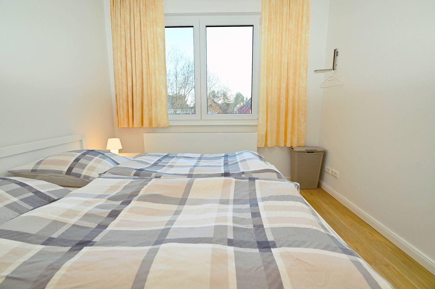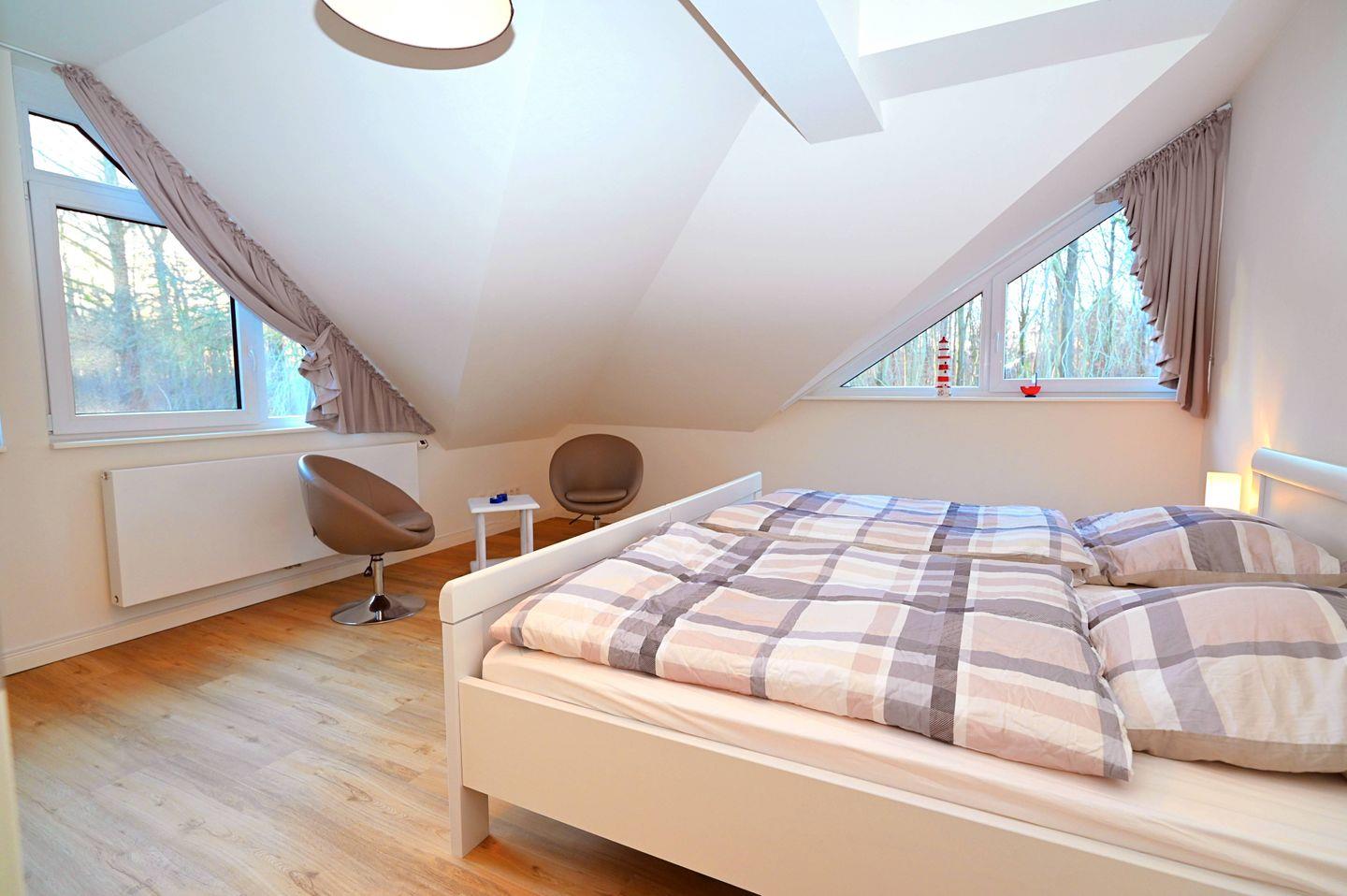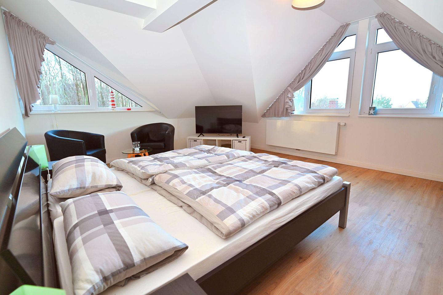 Die Ferienunterkunft verfügt über drei Schlafzimmer. Eines im Untergeschoss ausgestattet mit 2 Einzelbetten (als Doppelbett zusammengestellt). Zwei Schlafzimmer im Obergeschoss sind mit Doppelbetten sowie jeweils mit TV ausgestattet. Alle Betten verfügen über Einzelmatratzen (90 cm x 200 cm).