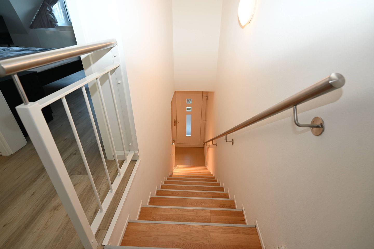 Mit einer großzügigen Wohnfläche von 110 m² auf zwei Etagen bietet die Ferienwohnung ausreichend Raum für bis zu sechs Personen. Drei separate Schlafzimmer schaffen Privatsphäre und Rückzugsmöglichkeiten, was insbesondere für Familien mit Kindern oder gemeinsam reisende Paare attraktiv ist. Die offene Küche ist zum Wohnzimmer hin ausgerichtet und mit modernen Geräten ausgestattet: Ceranherd, Backofen, extra Gefrierschrank, Kühlschrank, Spülmaschine, Kaffeemaschine, Espressomaschine (Smeg Retro Style Espresso Maschine), Wasserkocher und Toaster stehen ebenso zur Verfügung wie umfangreiche Küchenutensilien und Geschirr. Ein Essbereich mit ausreichend Platz grenzt direkt an, sodass das gemeinsame Kochen und Essen zu einem entspannten Erlebnis wird.