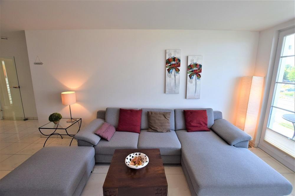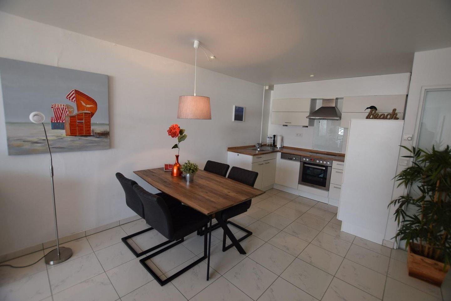 Die hochwertig ausgestattete Ferienwohnung befindet sich im 1 Obergeschoss. Hier finden Sie auf 60 qm einen modern ausgestatteten Wohn und Essbereich mit integrierter Küche, einen Schlafraum ( Doppelbett 160x200 cm), einen großen Westbalkon mit Meerblick, ein Bad mit Dusche sowie ein separates Gäste WC