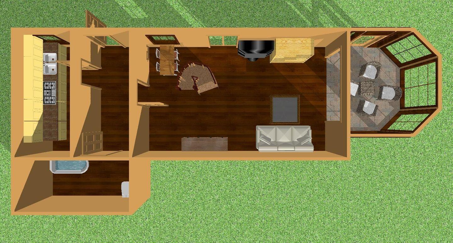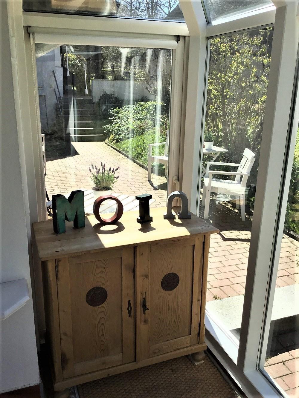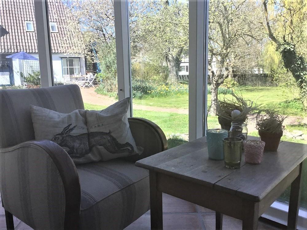 Das Wohnzimmer selbst ist durch den Wintergarten nicht nur besonders sonnig und hell, sondern besticht auch durch seine wunderschönen Holzdielen. Ein Kamin sorgt für zusätzliche Behaglichkeit, so dass auch in der rauen Jahreszeit kuschelig am Feuer gesessen werden kann. Hierzu lädt die gemütliche Sitzlandschaft ebenso ein wie der Essbereich mit Platz für bis zu drei Personen. Liebevoll arrangierte Details runden den Wohnraum ab.