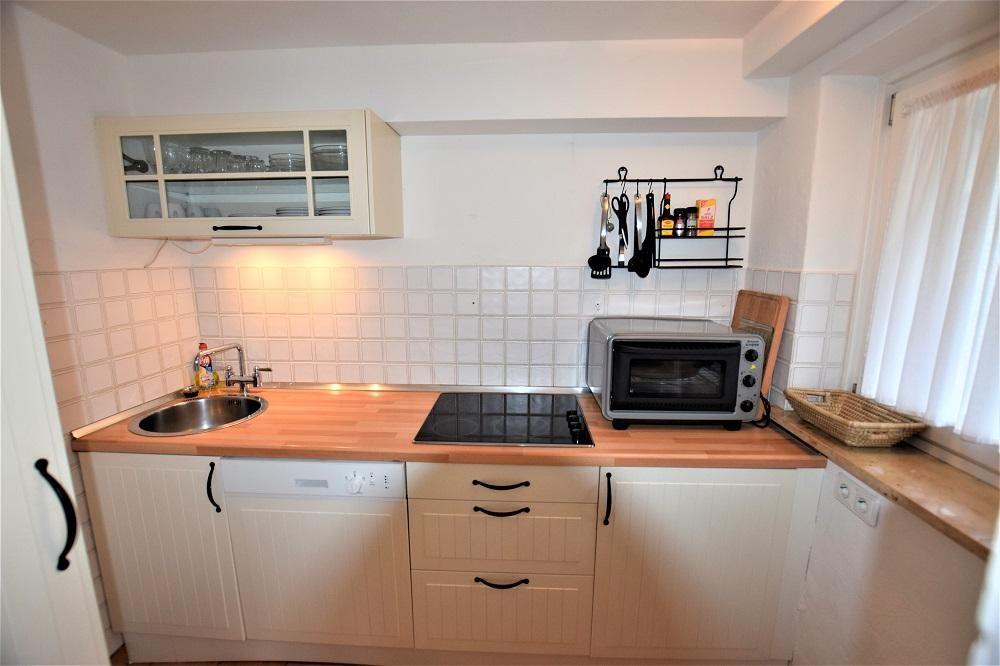 In der modernen Küche im Landhausstil finden sich alle Annehmlichkeiten, die das Kochen auch im Urlaub zur Freude werden lassen. Hierzu gehören ein Ceranfeld, Backofen, Kühlschrank (mit Gefrierfach), Kaffeemaschine, Wasserkocher und Toaster. Eine Spülmaschine kümmert sich zuverlässig um den anfallenden Abwasch. Selbstverständlich stehen auch Geschirr, Besteck und Küchenutensilien zur Verfügung.