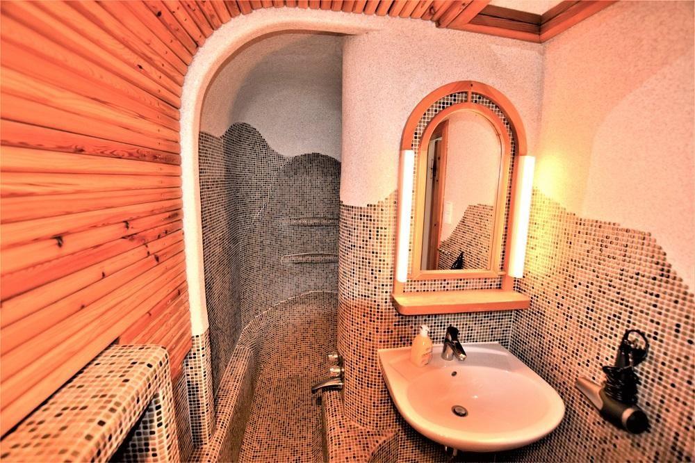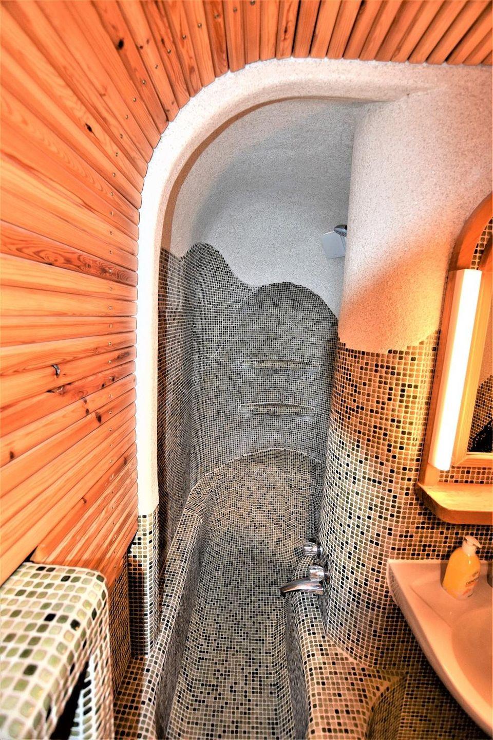 Herzstück und Highlight der Wohnung ist ihr im Hundertwasser-Stil designtes Badezimmer. Weiche, fließende Formen, individueller Charme, eine handgegossene Badewanne, die auch als Dusche genutzt werden kann, treffen hier auf einzigartige Mosaikfliesen und sandverputzte Wände. Auch der Komfort kommt in diesem Bad nicht zu kurz: eine Fußbodenheizung sorgt für ein besonders angenehmes Raumklima.