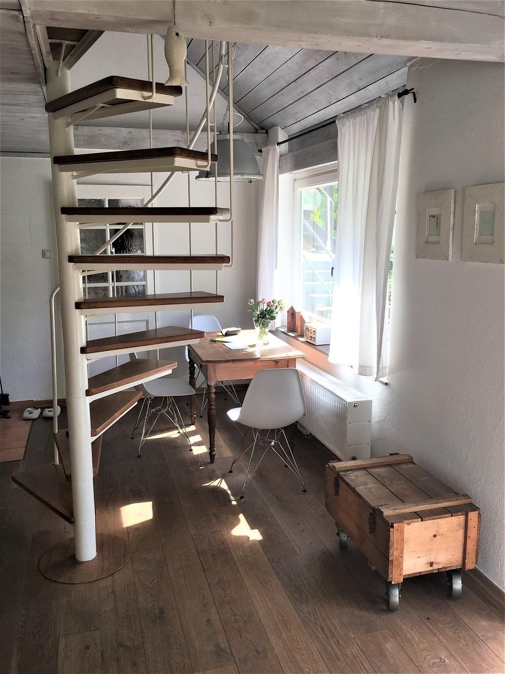 Über die Wendeltreppe im Wohnzimmer kann die zweite Etage der Unterkunft erreicht werden. Hier befinden sich die Schlafräume des "Atelierhauses".