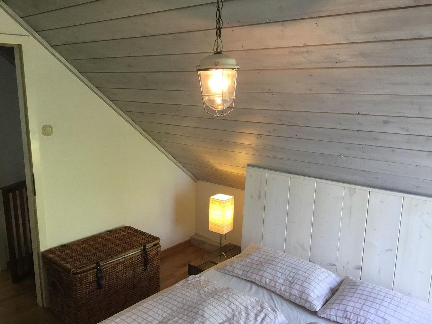 Im ersten Schlafzimmer liegt das Doppelbett (160x200cm) besonders gemütlich unter der holzvertäfelten Schräge. Durch das Fenster kann man die Ostsee eingeschränkt sehen.