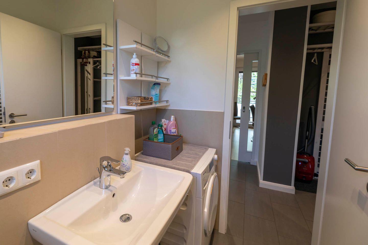Waschmaschine, Wäscheständer, Bugelbrett, Bügeleisen.