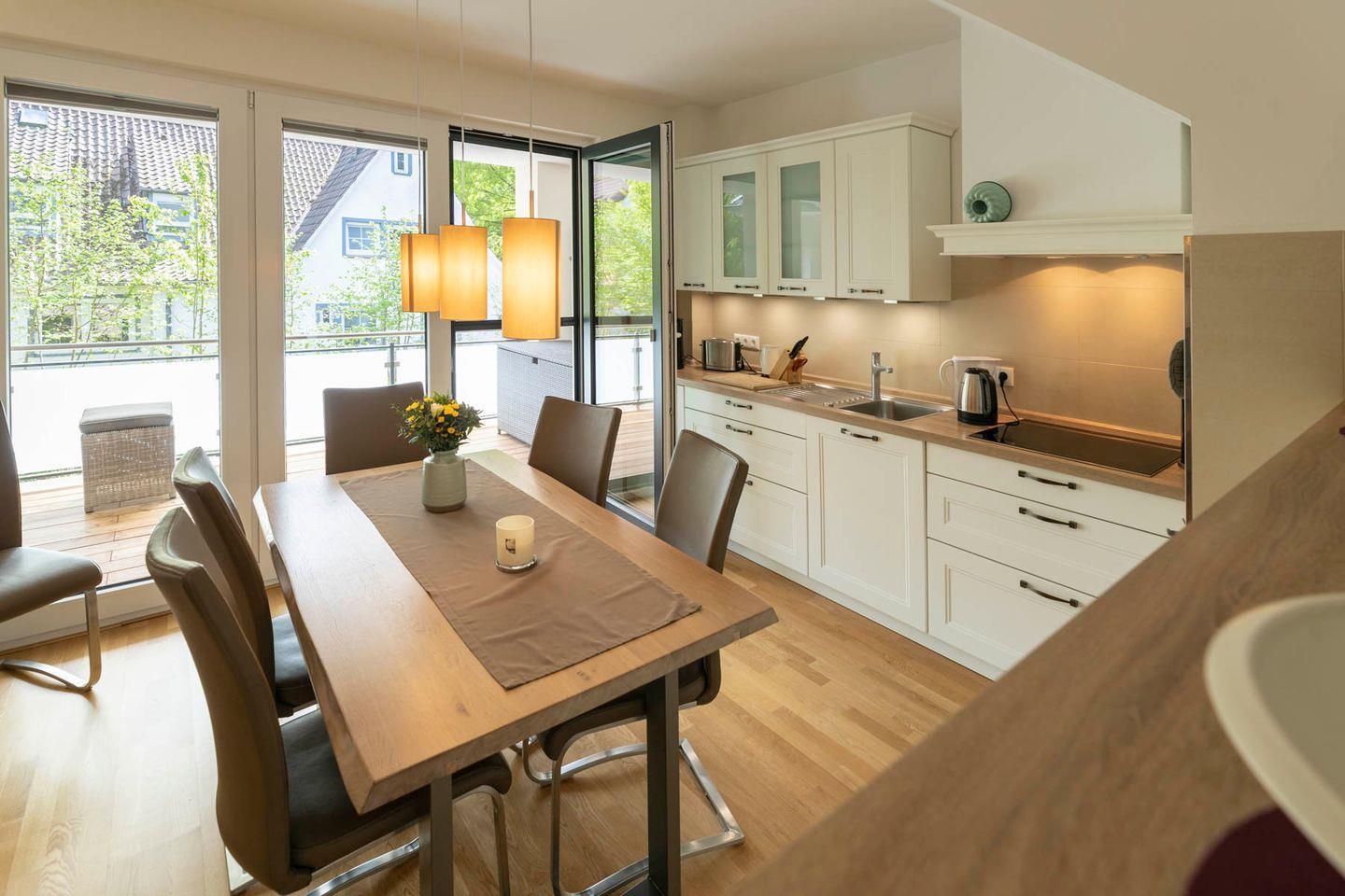 Essbereich und integrierte Einbauküche.