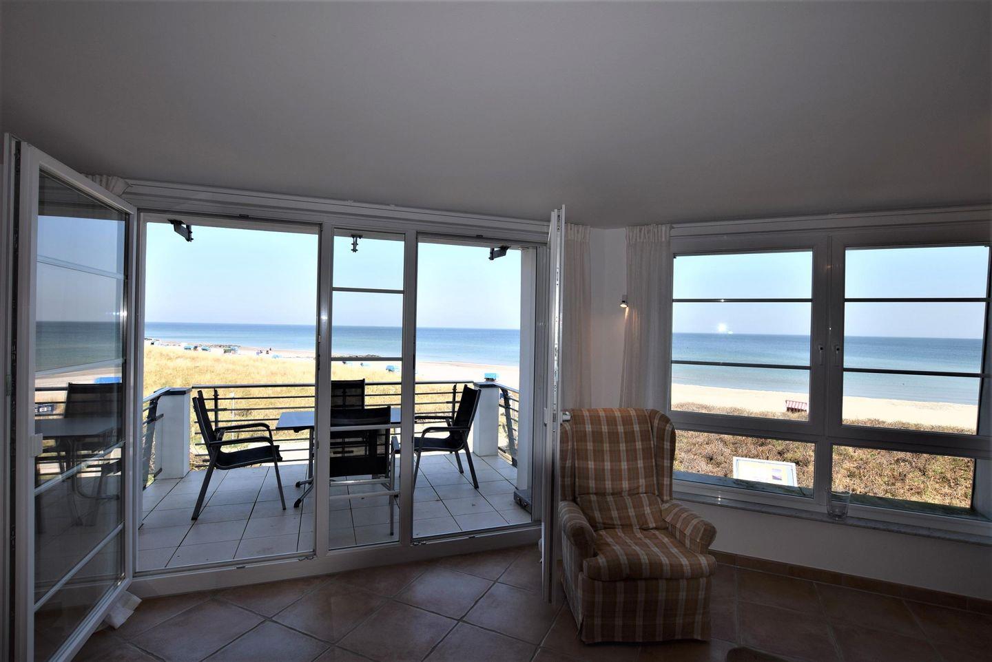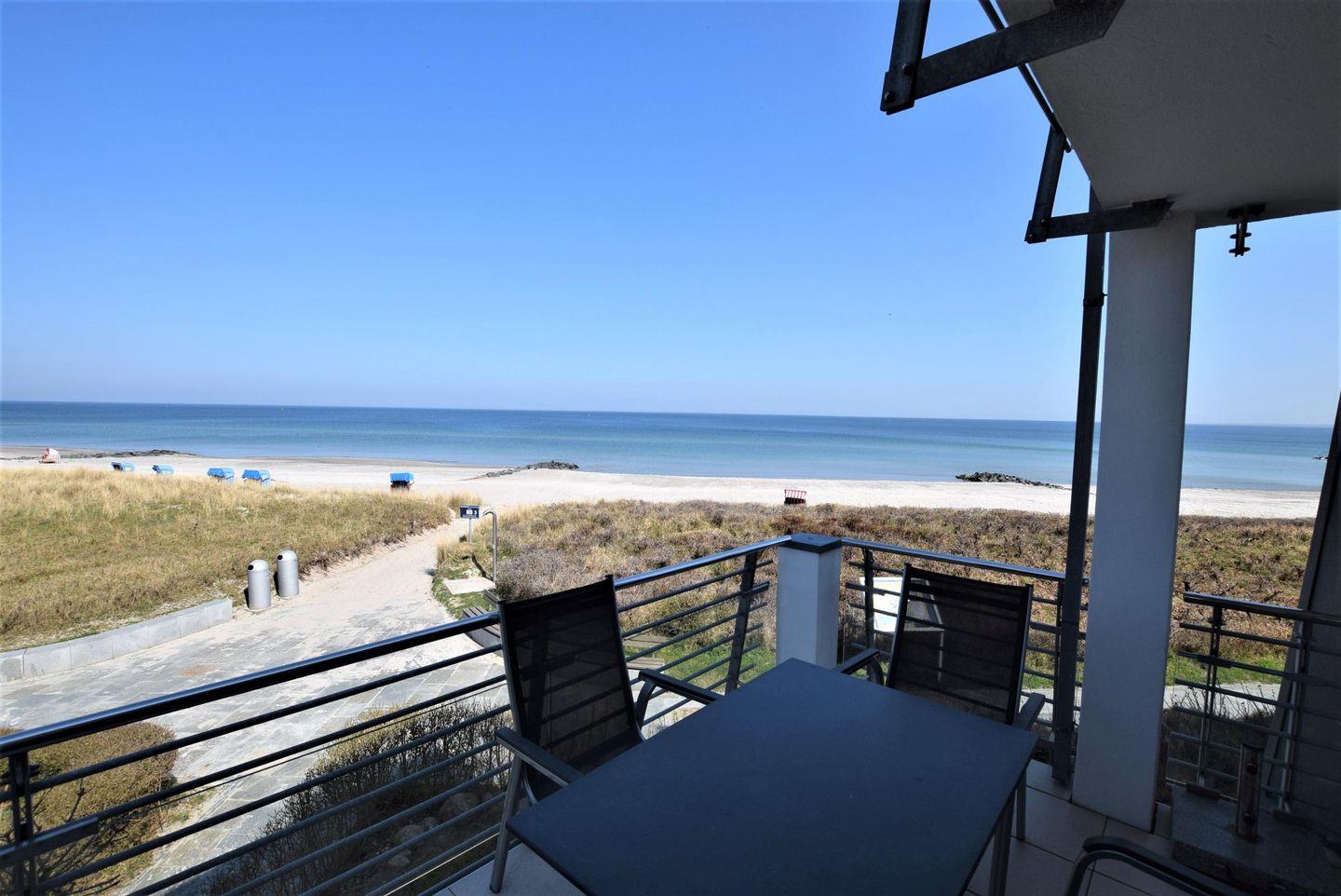 Direkt ans Wohnzimmer grenzt der große Balkon mit Meerblick welcher zum Verweilen einlädt.