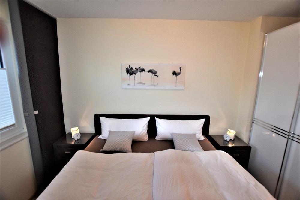 Zwei Schlafzimmer bieten in dieser Ferienwohnung Platz für bis zu vier Personen. Der erste Raum ist mit einem komfortablen Bettsofa (140x200cm) ausgestattet, im zweiten Zimmer befindet sich ein großes Boxspringbett (180x200cm). Beide Schlafzimmer verfügen zudem über Kleiderschränke, in welchen das eigene Gepäck untergebracht werden kann.