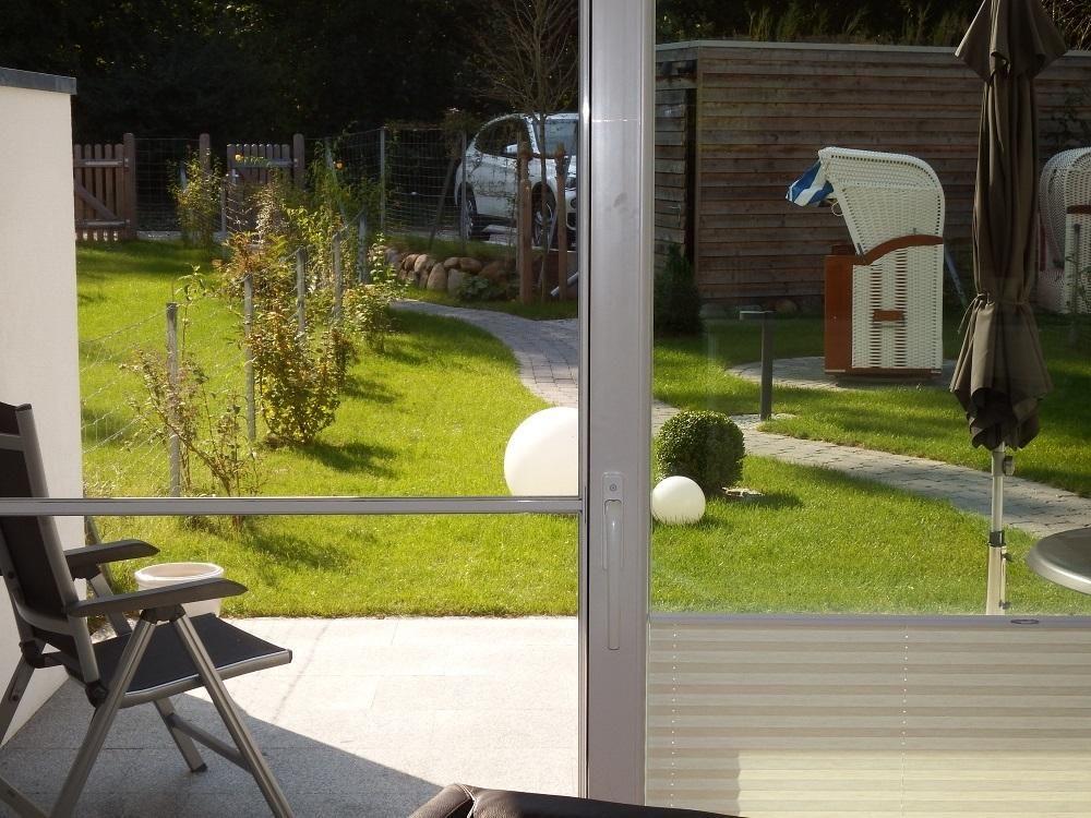 Ein schöner Garten und die sonnige Südterrasse machen den Außenbereich dieser Ferienunterkunft besonders einladend. Durch eine komfortable Schiebetür kann die Terrasse von der Wohnung aus betreten werden. Hier stehen Gartenmöbel und ein Sonnenschirm zur Verfügung und laden zum entspannten Verweilen ein.