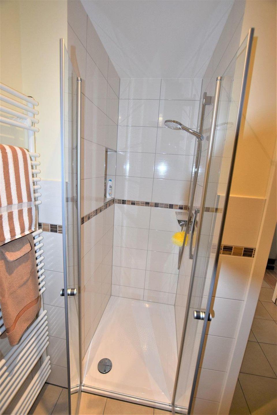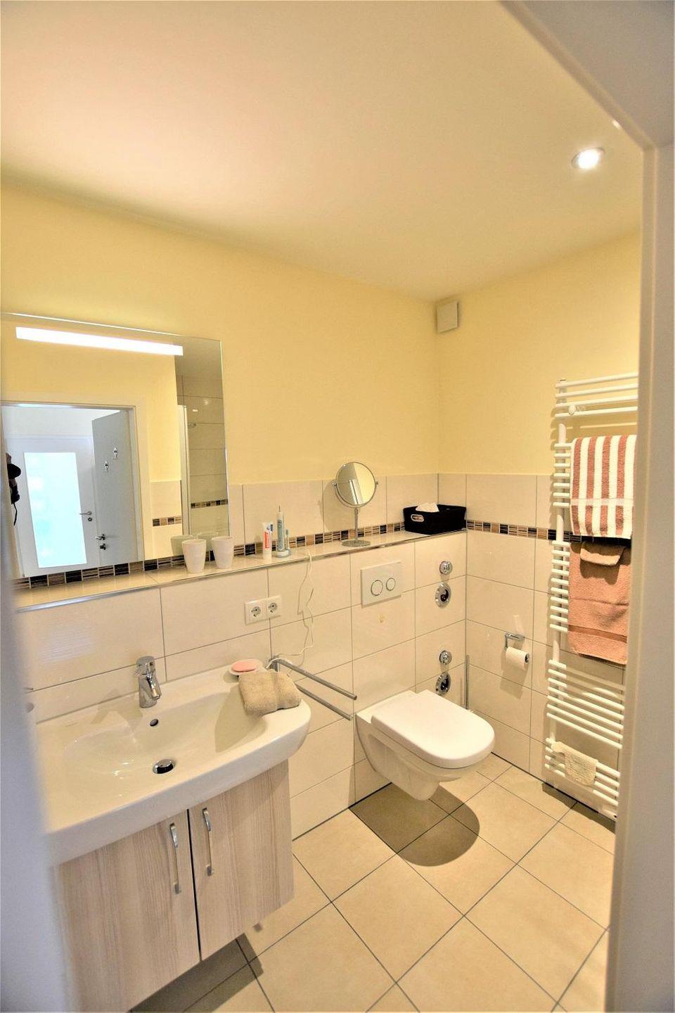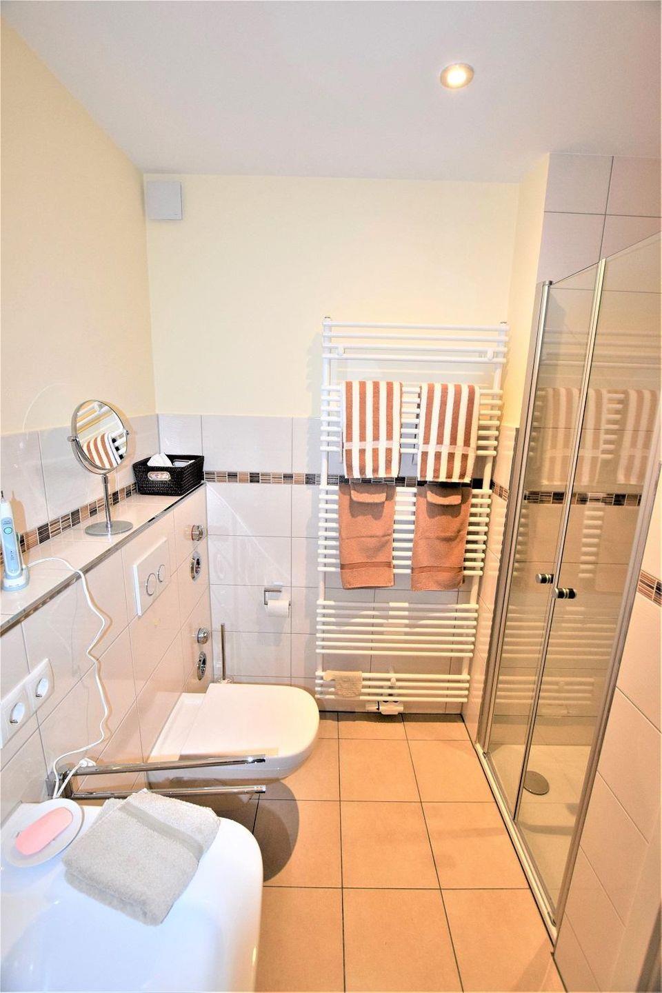 Das Duschbad vermittelt durch seine weißen Fliesen mit umlaufender Bordüre, Deckenspots und den Handtuchwärmer ein ebenso modernes Wohngefühl wie der Rest der Unterkunft. Die Dusche ist bodentief und geräumig. Das Waschbecken mit Unterschrank und Spiegel und das WC runden den Badbereich ab.