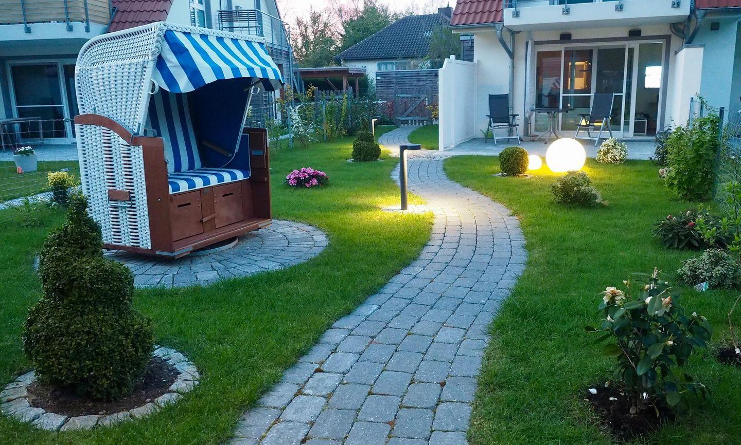 Ein gepflasterter Weg führt durch den schön bepflanzten Garten zum eigenen Strandkorb. Dieser ist drehbar und mit einem Schwenk- und einem Klapptisch ausgestattet.