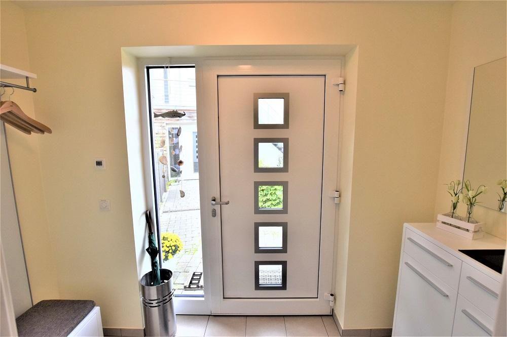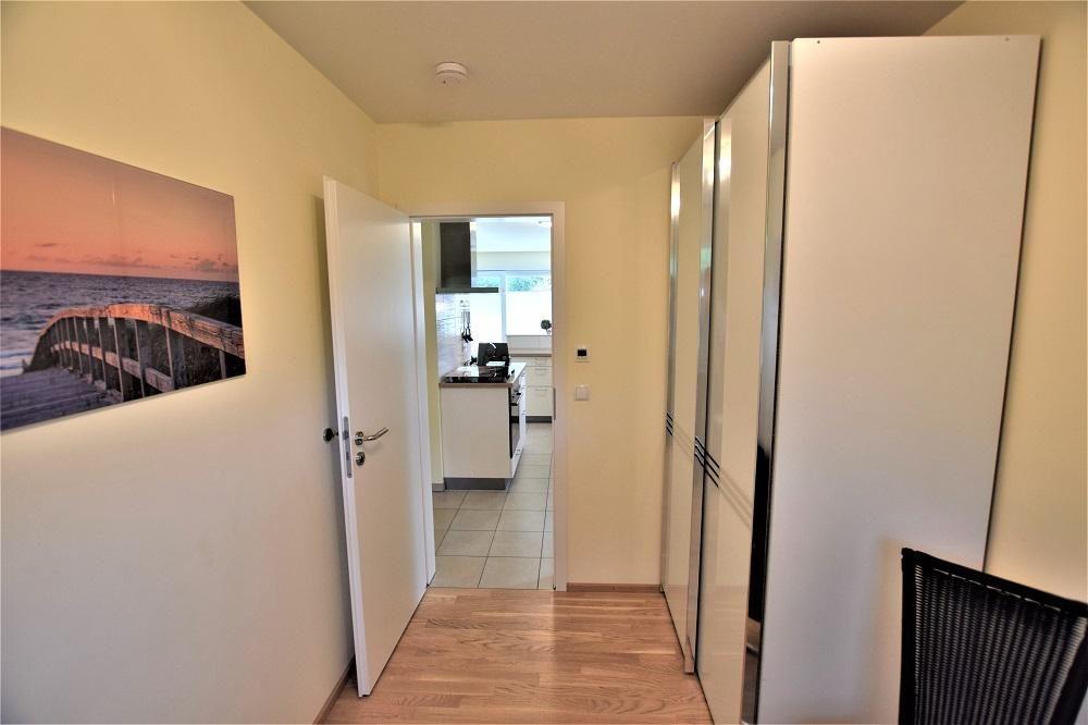 Hell und modern empfängt die Ferienwohnung "Baltic Sea" ihre Gäste. Der Windfang im Eingangsbereich bietet neben einem Schuhschrank auch einen Spiegel, eine Garderobenwand und eine Sitzbank.