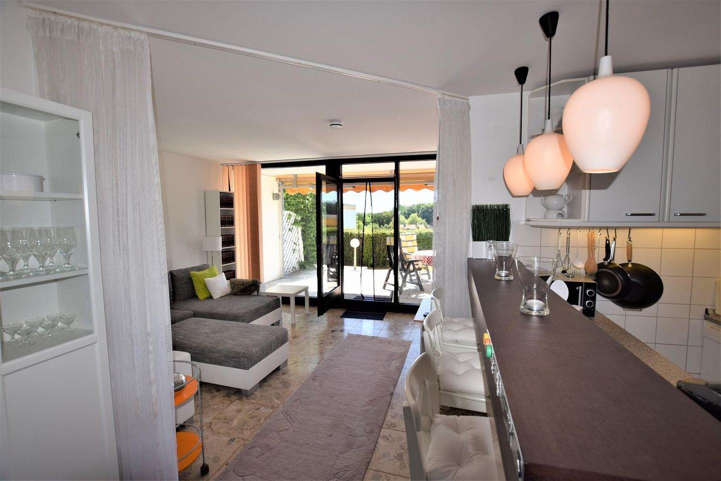 Die Wohnung verfügt über ein großzügiges Wohnzimmer mit angeschlossener offener Küche sowie Essecke für 6 Personen