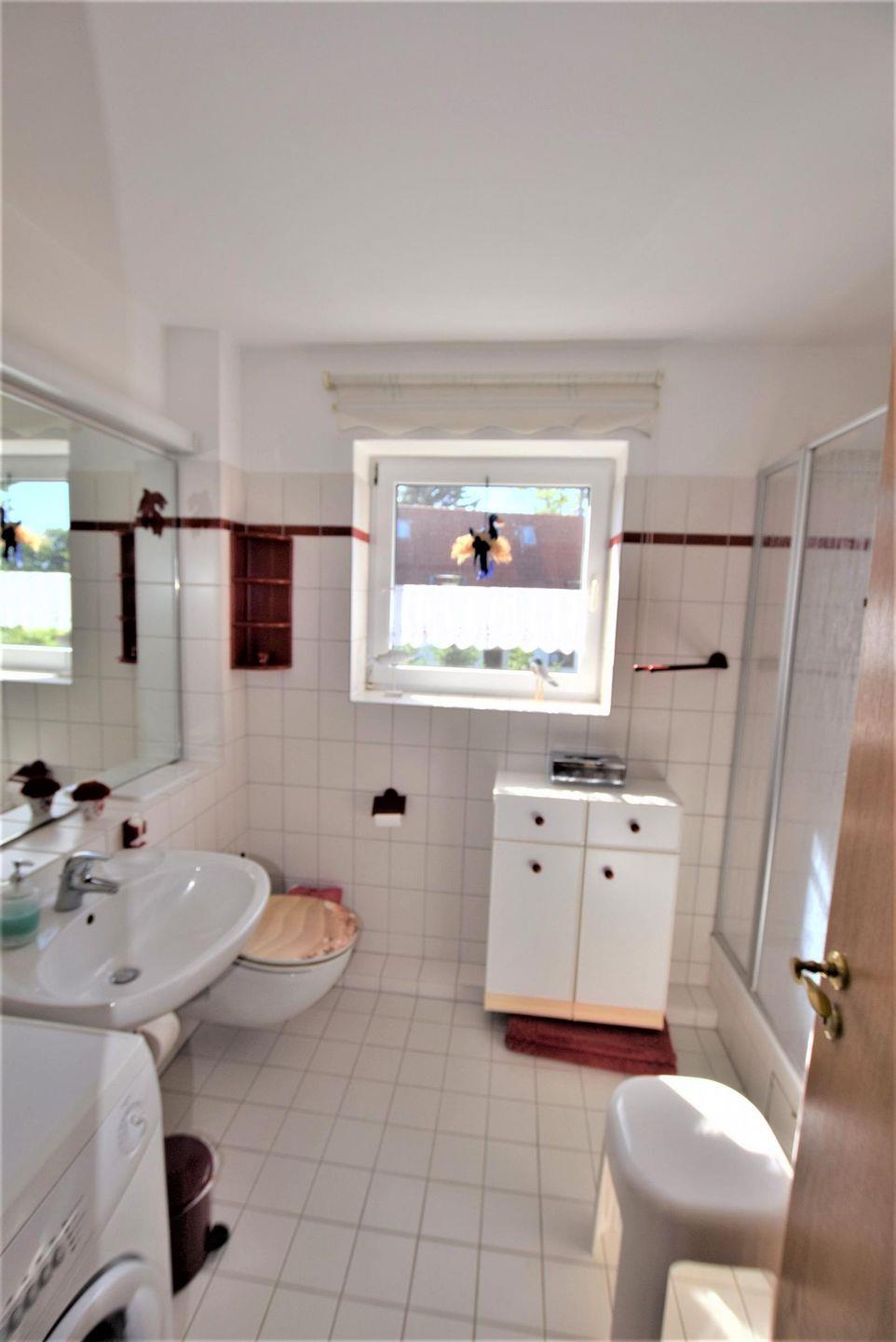 Das Badezimmer verfügt über Dusche, WC, Waschbecken, Spiegel und Kosmetikspiegel,; ein Haartrockner ist vorhanden. Für längere Aufenthalte stehen Waschmaschine und Trockner zur gemeinschaftlichen Nutzung bereit, ebenso Bügeleisen und Bügelbrett; Wäscheständer und Staubsauger sind ebenfalls vorhanden.