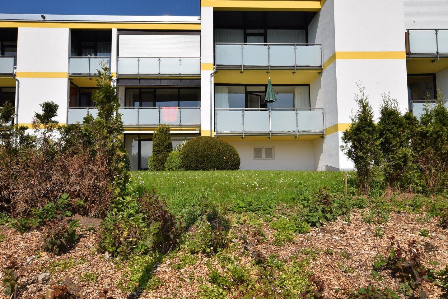 Balkon mit Gartenmöbel und Sonnenschirm.